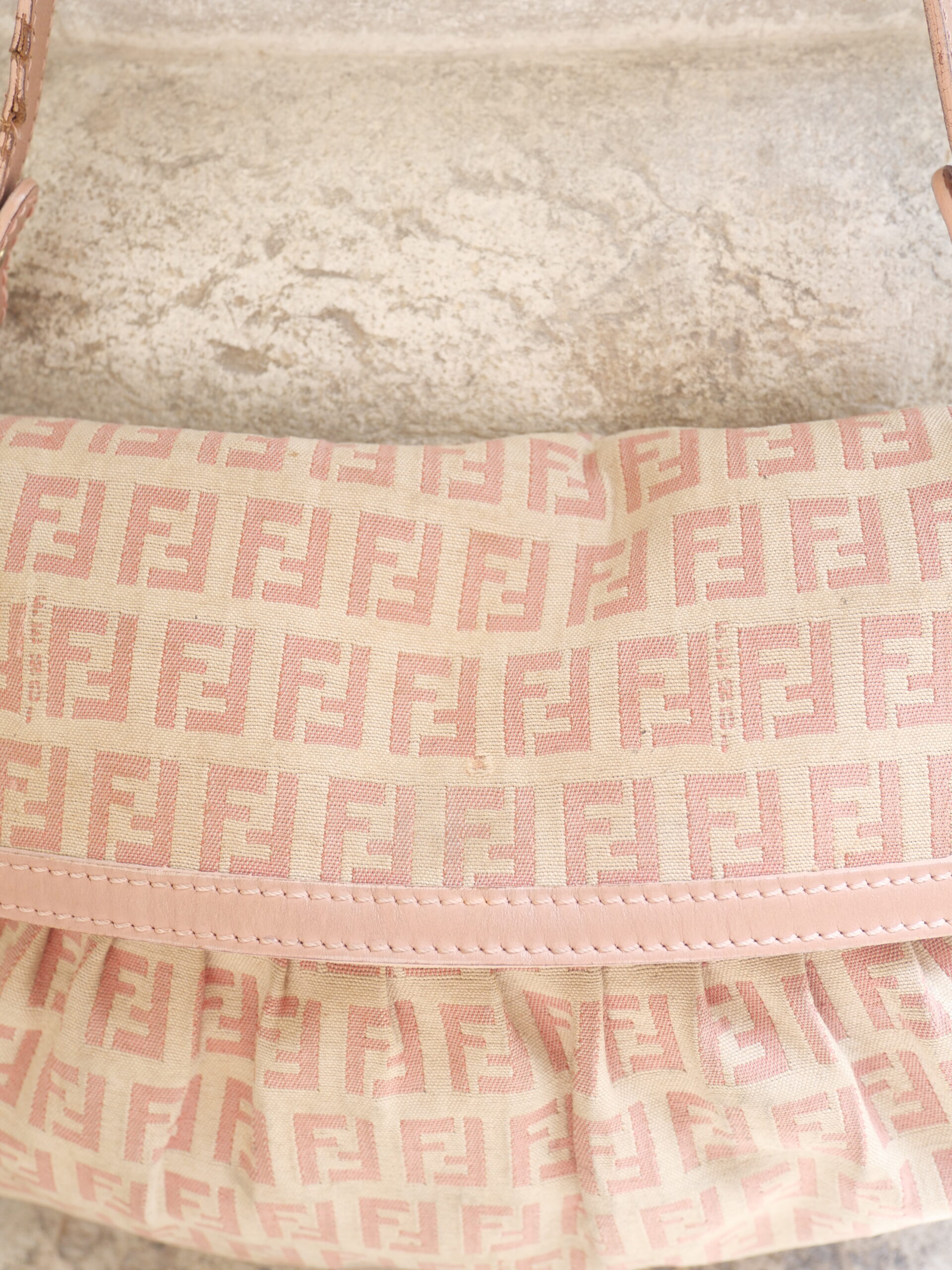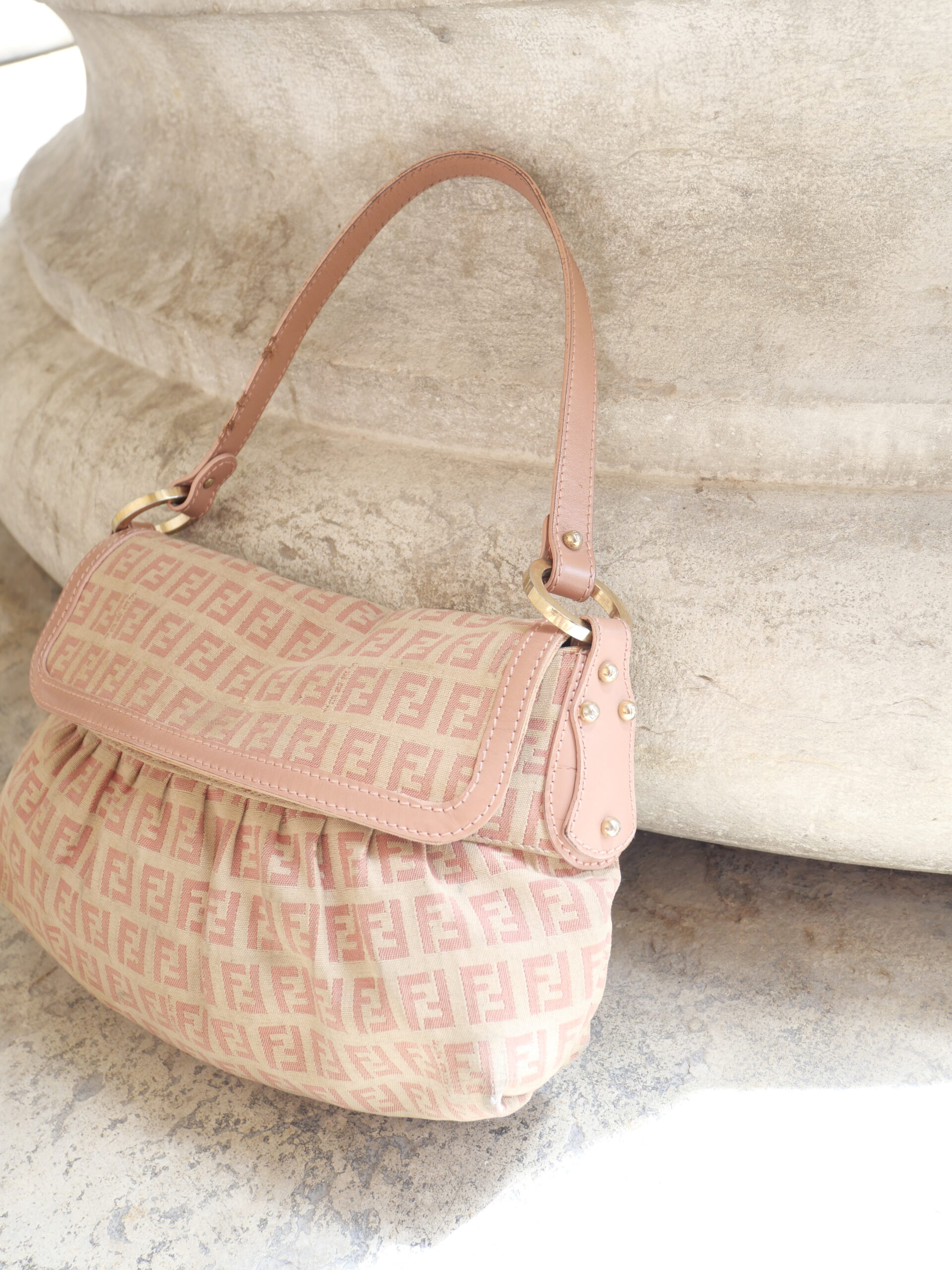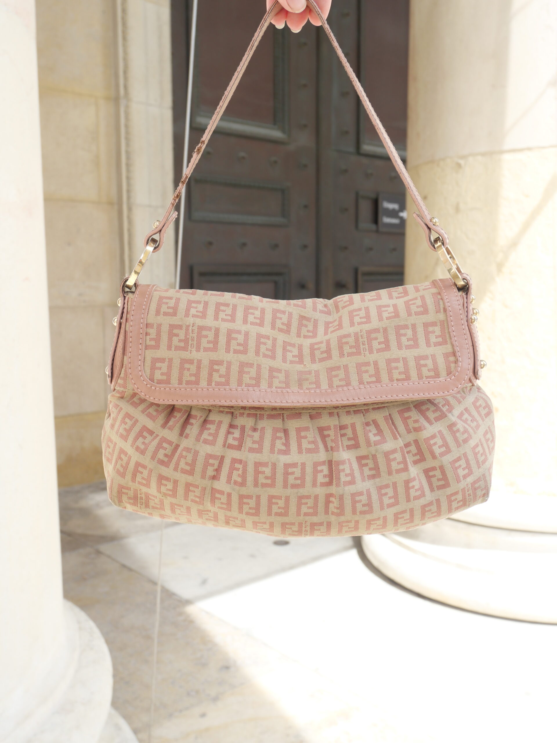 Die perfekte City Shoulder Bag für den Sommer. Gefertigt im klassischen FF Zucchino Fendi Muster und mit rosanen Lederdetails, ist diese Fendi Schultertasche ein absoluter Hingucker.