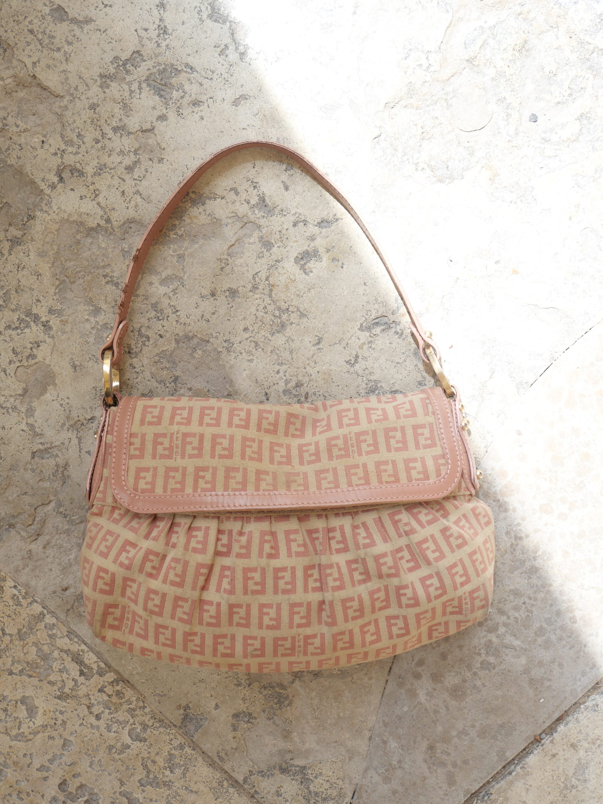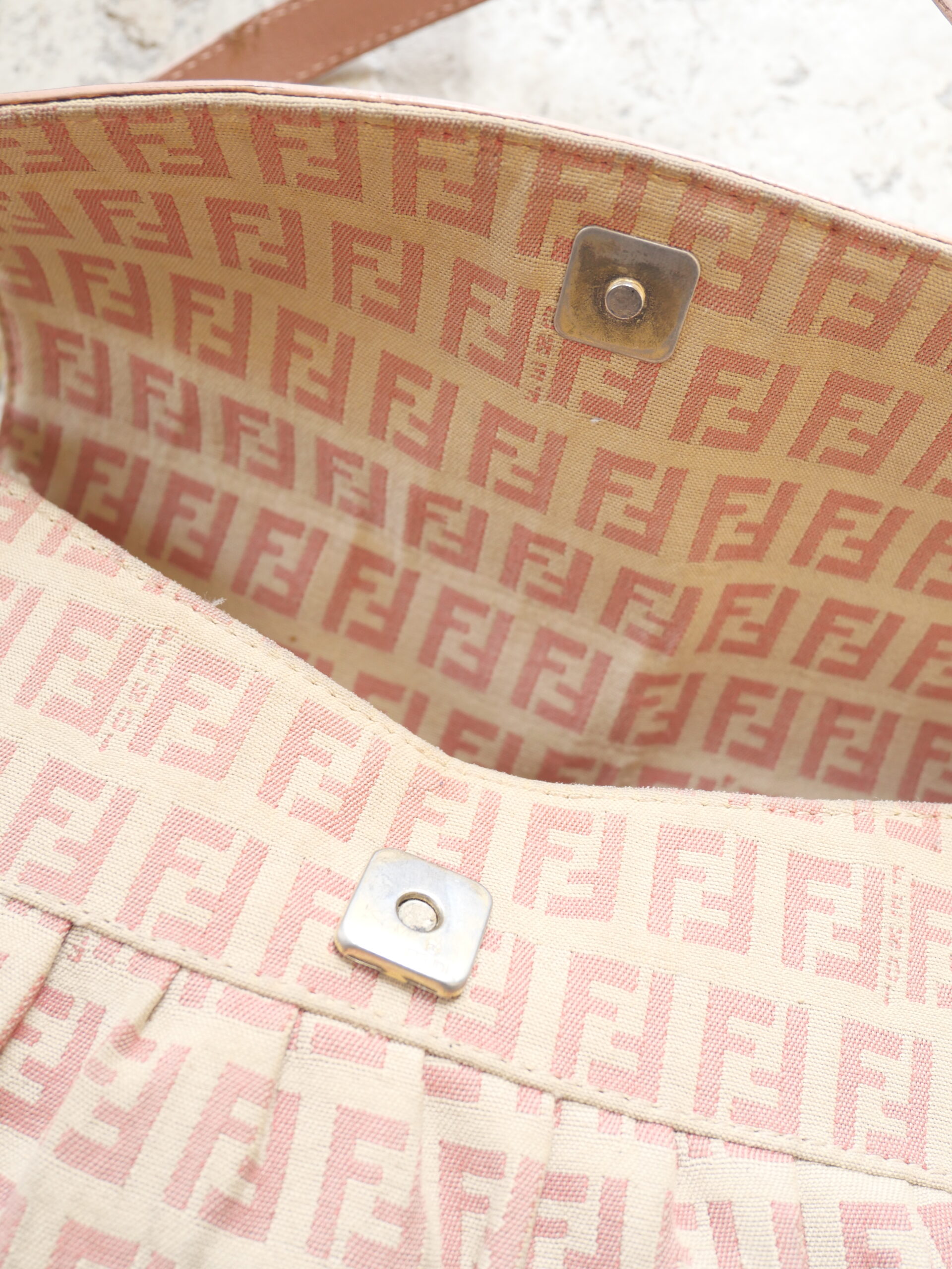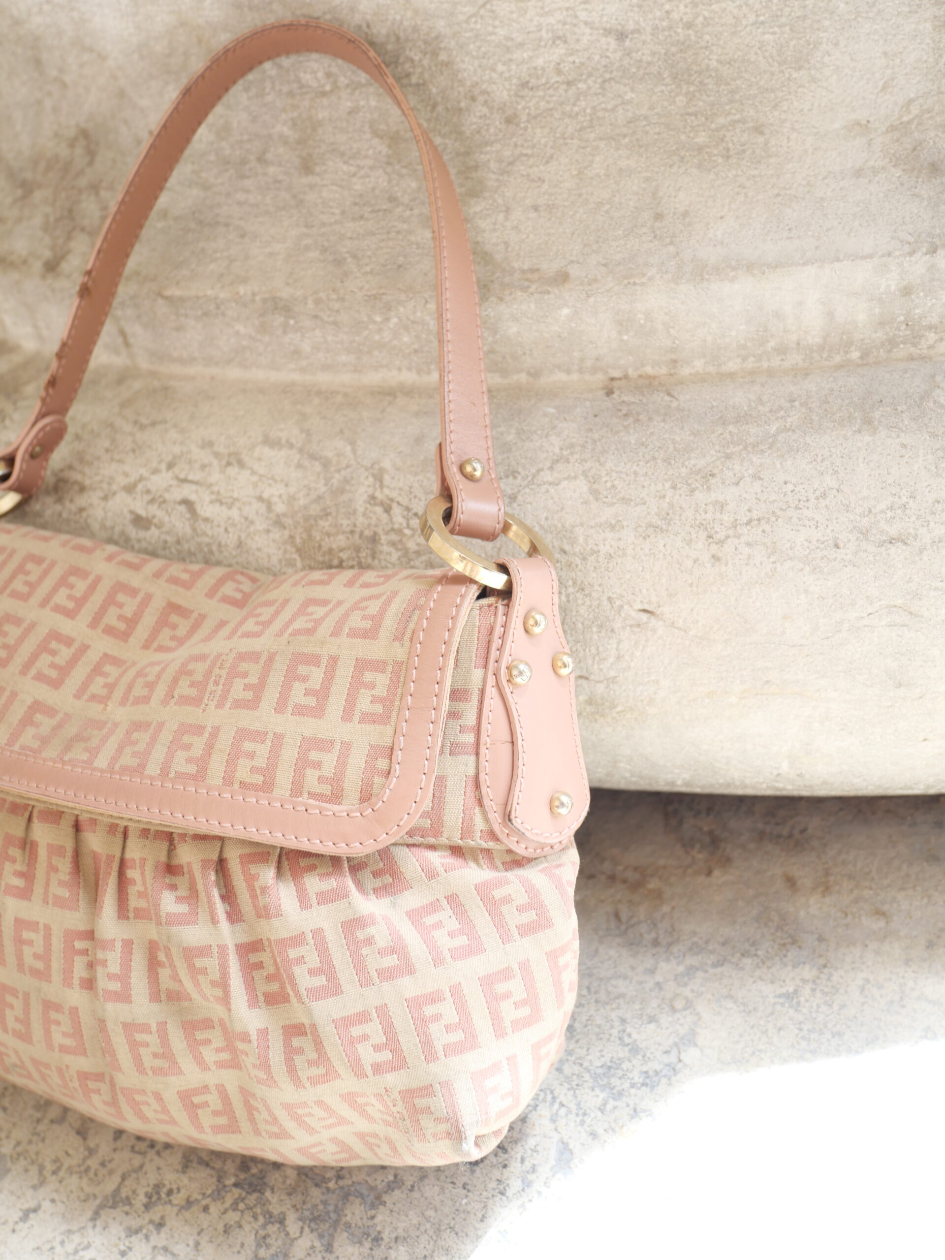Die perfekte City Shoulder Bag für den Sommer. Gefertigt im klassischen FF Zucchino Fendi Muster und mit rosanen Lederdetails, ist diese Fendi Schultertasche ein absoluter Hingucker.