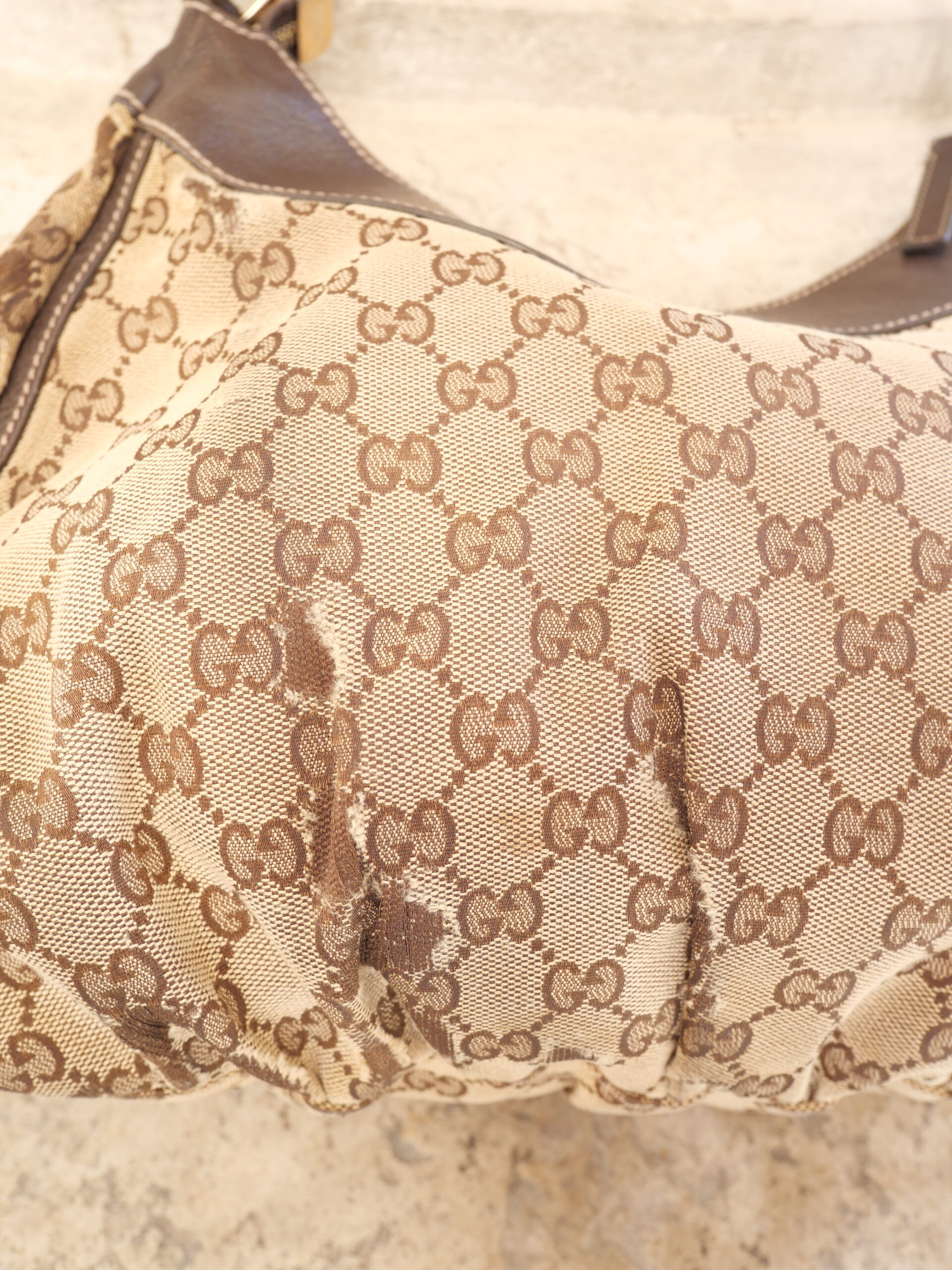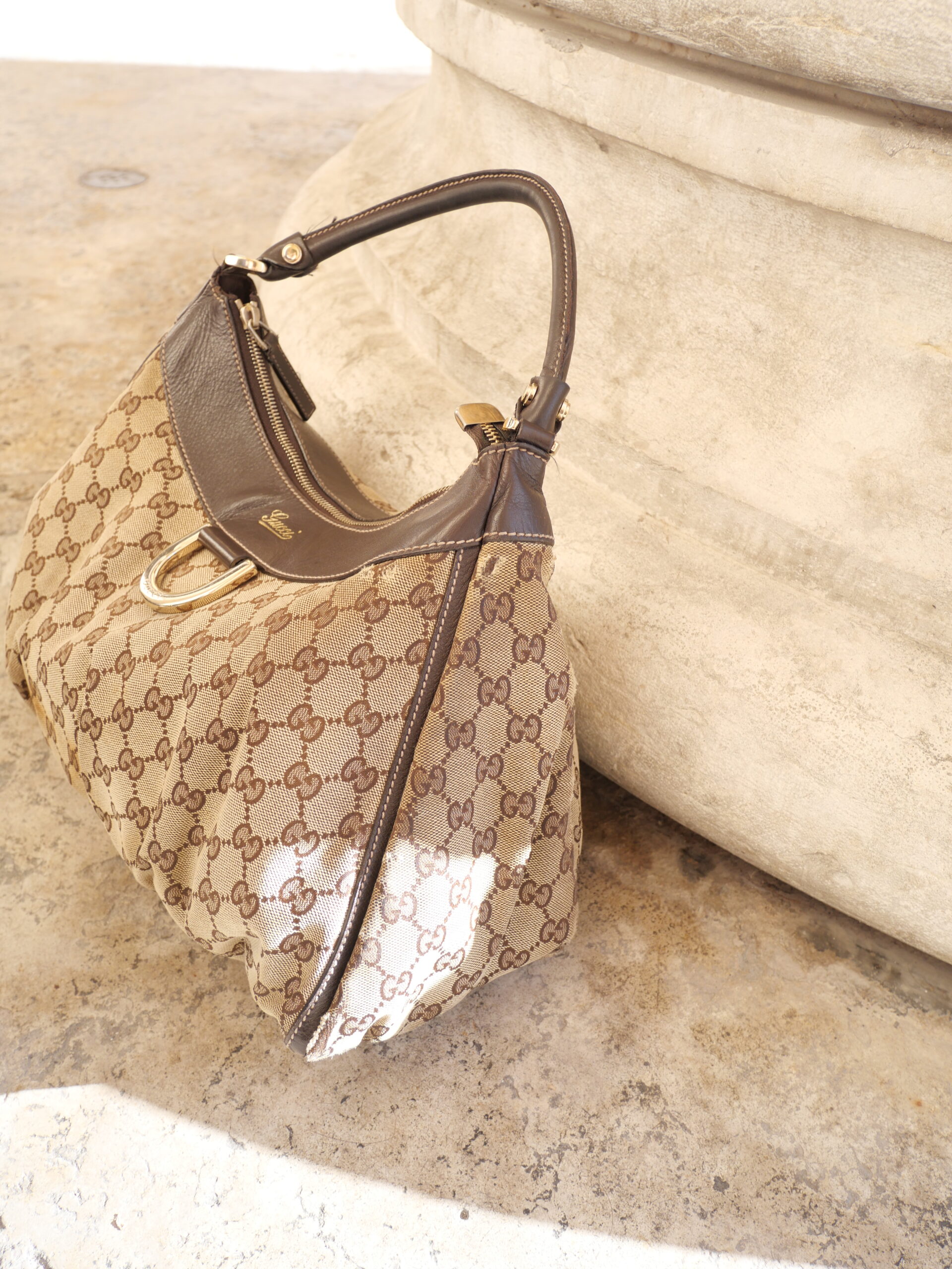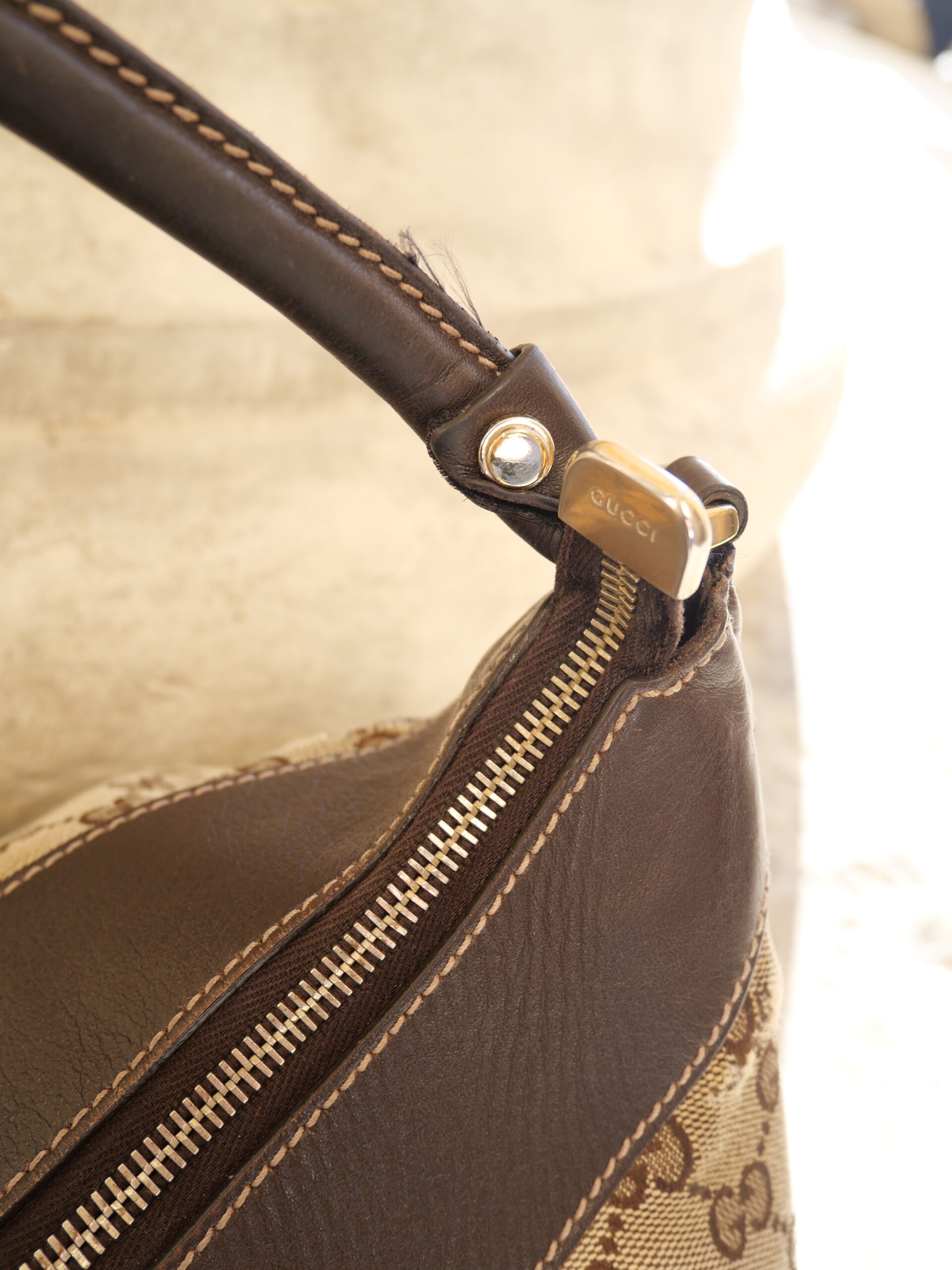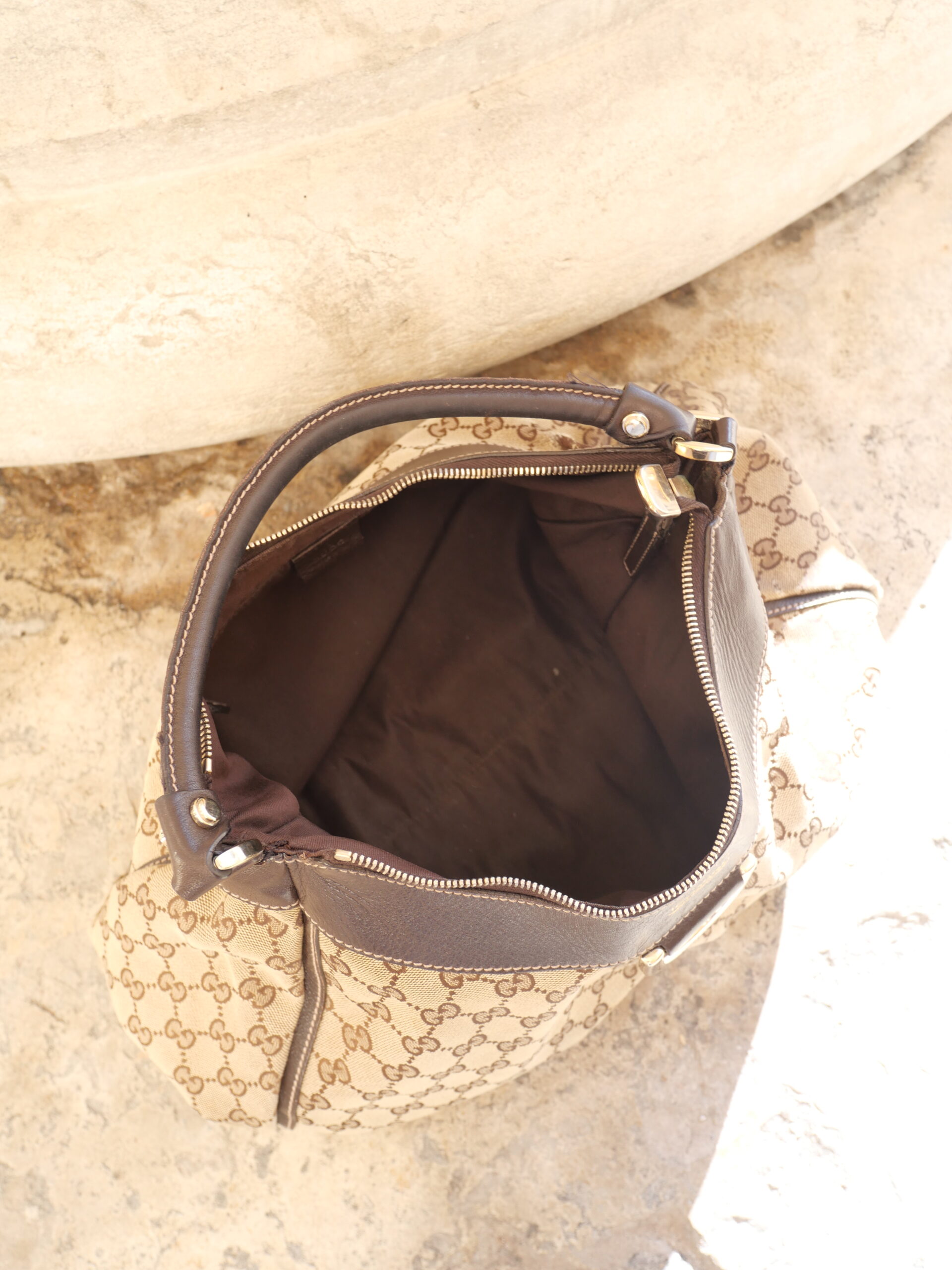 Diese Gucci Schultertasche ist der perfekte Begleiter für jeden Tag. Das Monogramm-Canvas und die braunen Lederdetails verleihen der Tasche einen einzigartigen Look, der sich wunderbar mit jedem Outfit kombinieren lässt. Die goldene Hardware sorgt für einen edlen Touch und macht die Tasche zu einem echten Hingucker. Sie ist super praktisch und bietet genug Platz für alle Essentials. Besonders in der großen Ausführung passt ein kleiner Laptop oder ein iPad hinein. Diese Tasche bringt einfach das gewisse Etwas mit. Ein tolles Stück, das man einfach haben möchte!