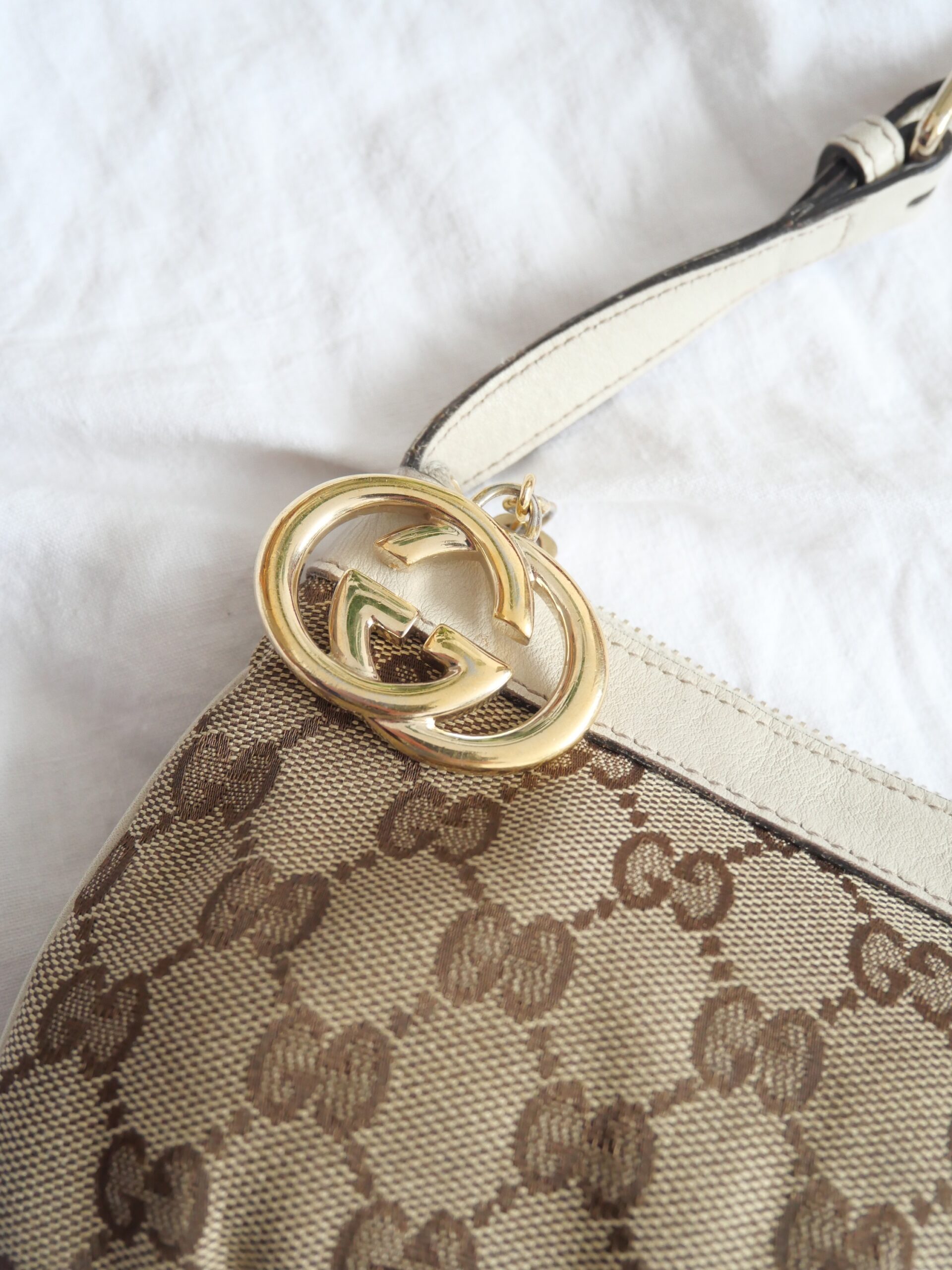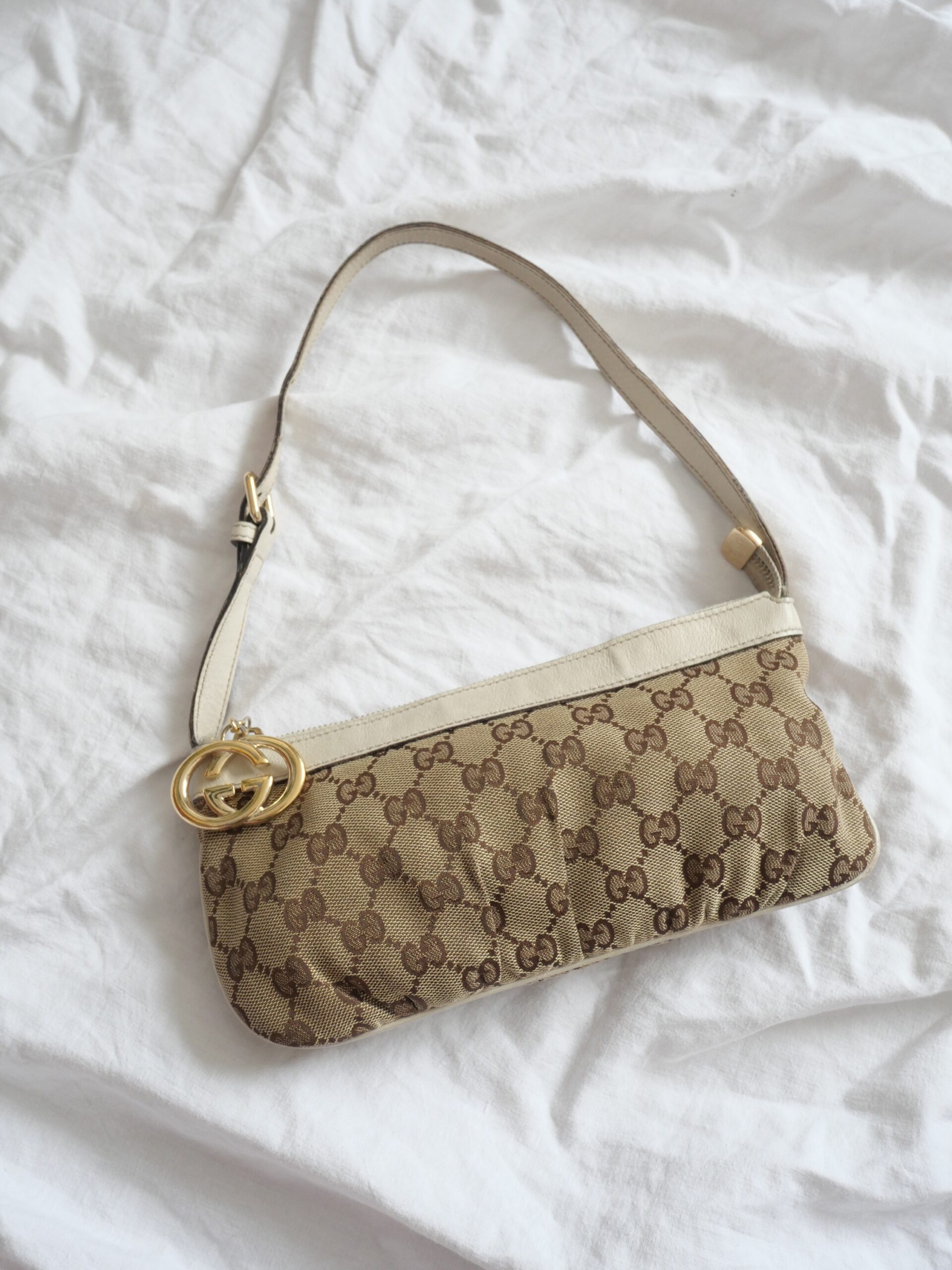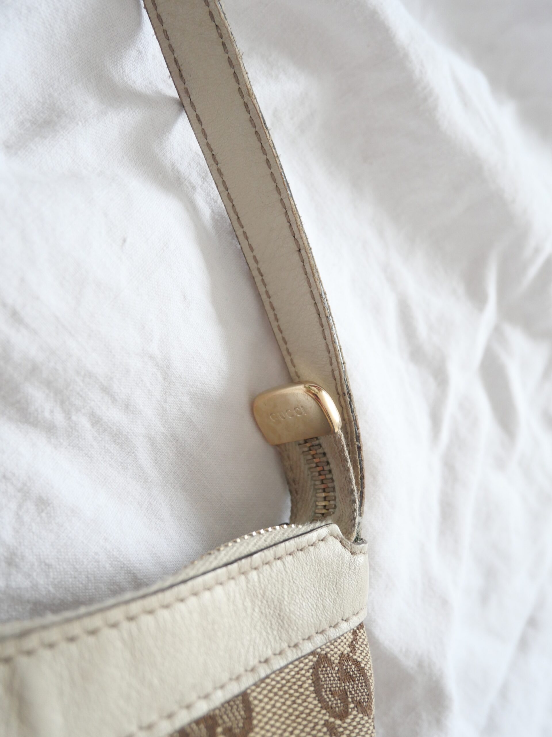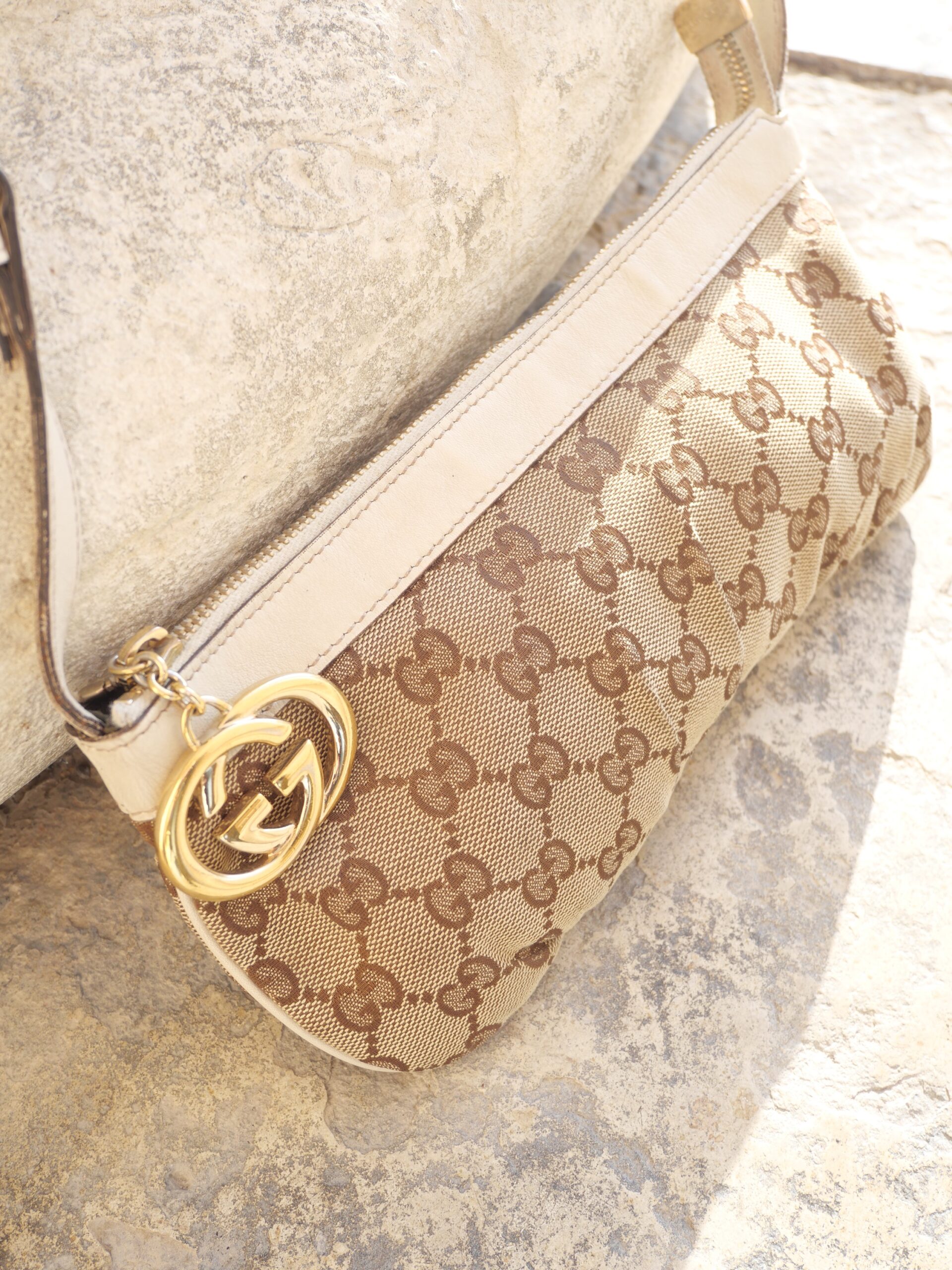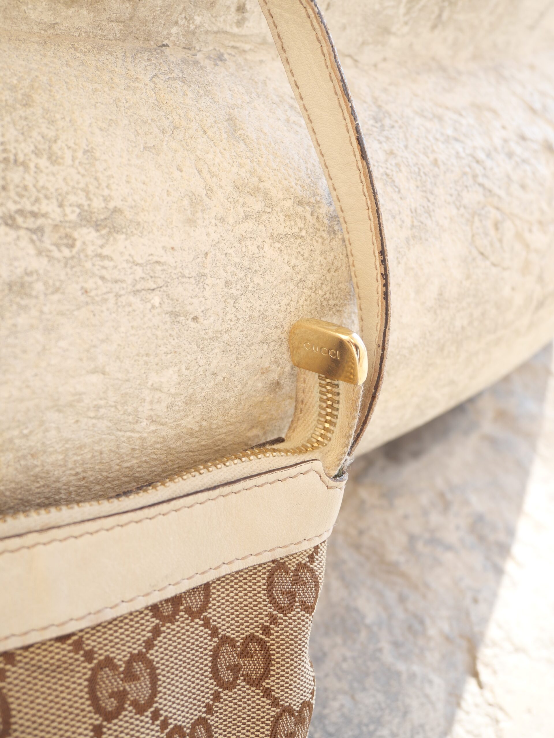 Die angesagte Vintage Gucci Schultertasche aus braunem Canvas Stoff verfügt über goldene Details und einen langen Schulterriemen. Besonders an der Tasche ist der große Gucci Charm am Reißverschluss. Innen ist sie ausgestattet mit braunem Stoff und einer Innentasche.