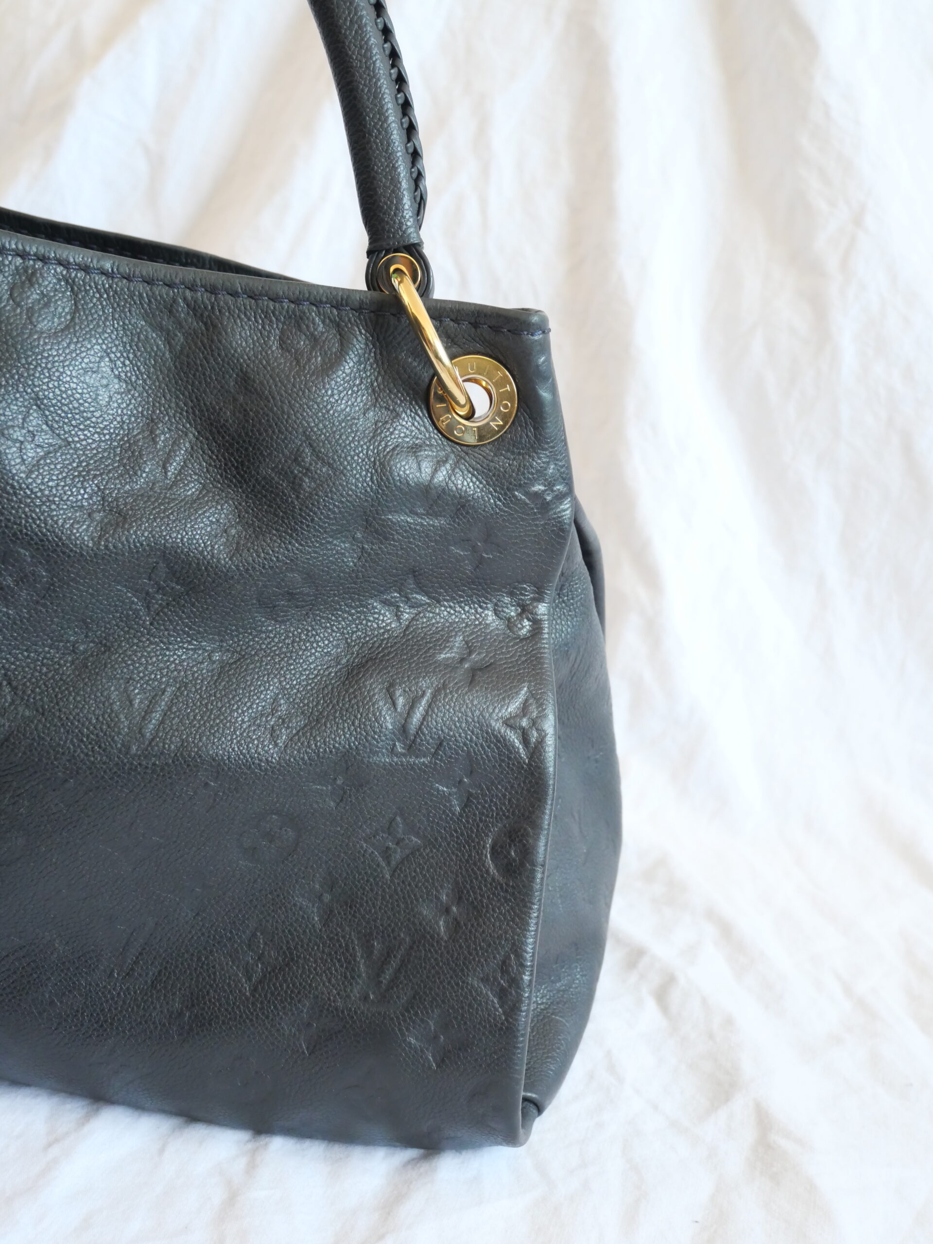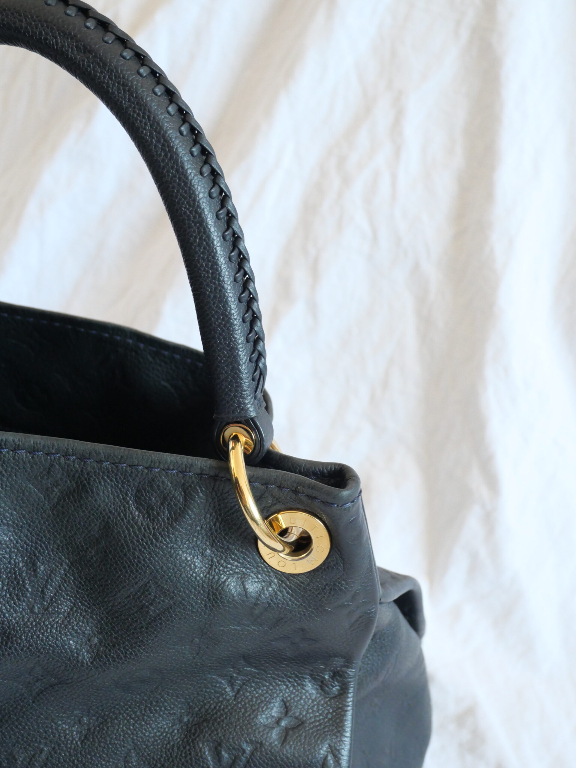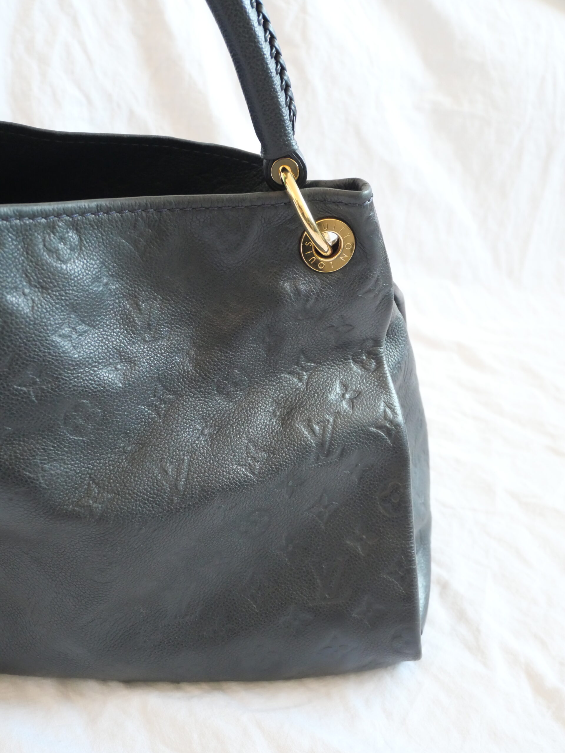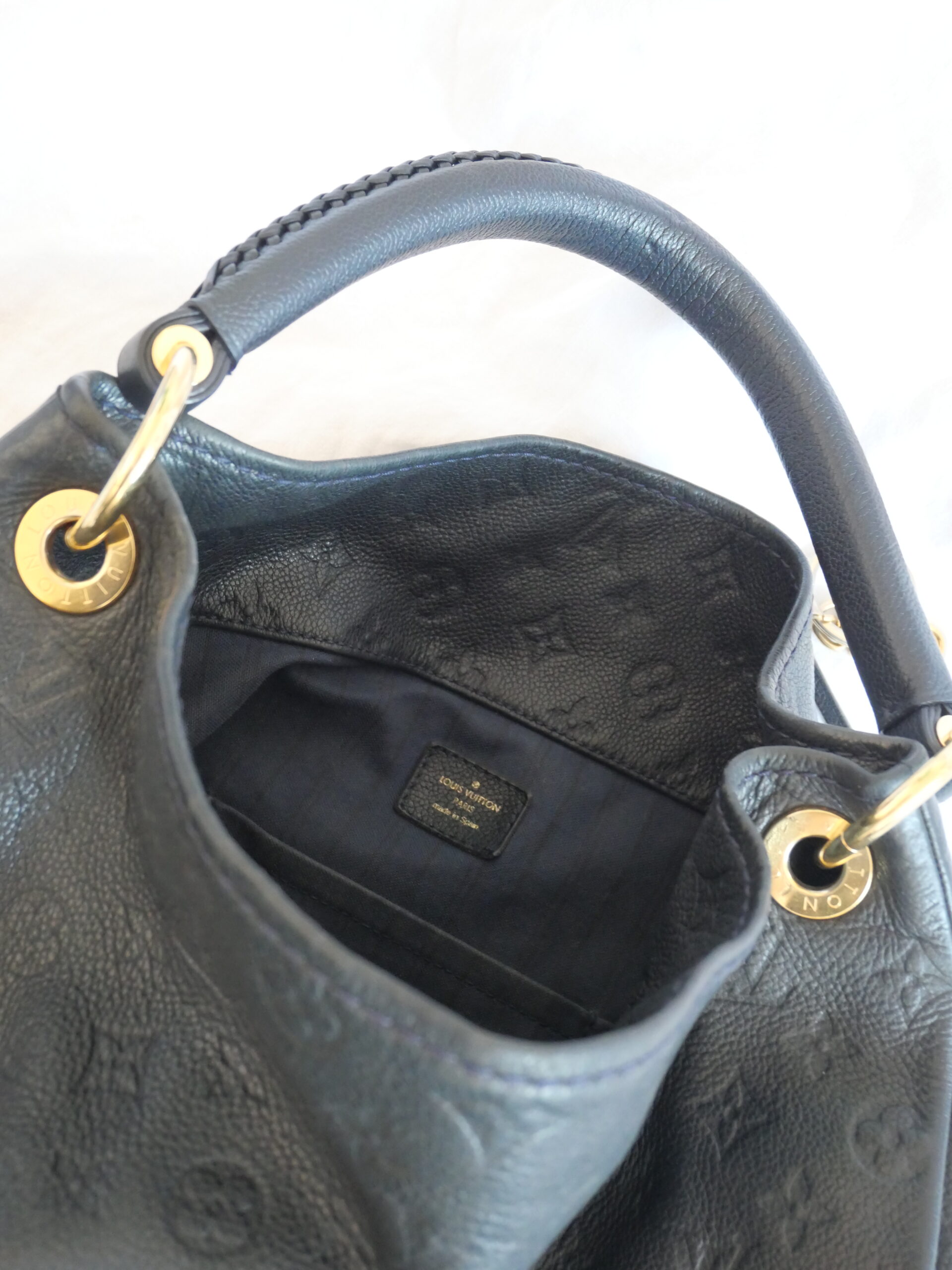 Die Louis Vuitton Artsy ist eine der begehrtesten Taschen des Designers. Sie verfügt über einen geräumigen Innenraum mit mehreren Innenfächern. Durch Ihren abgerundeten Ledergriff lässt sie sich bequem über die Schulter oder in der Hand tragen. Die Farbe Infini Blau ist ein sehr dunkel strahlendes blau. Die Artsy befindet sich in hervorragendem Zustand und kommt mit Staubbeutel.