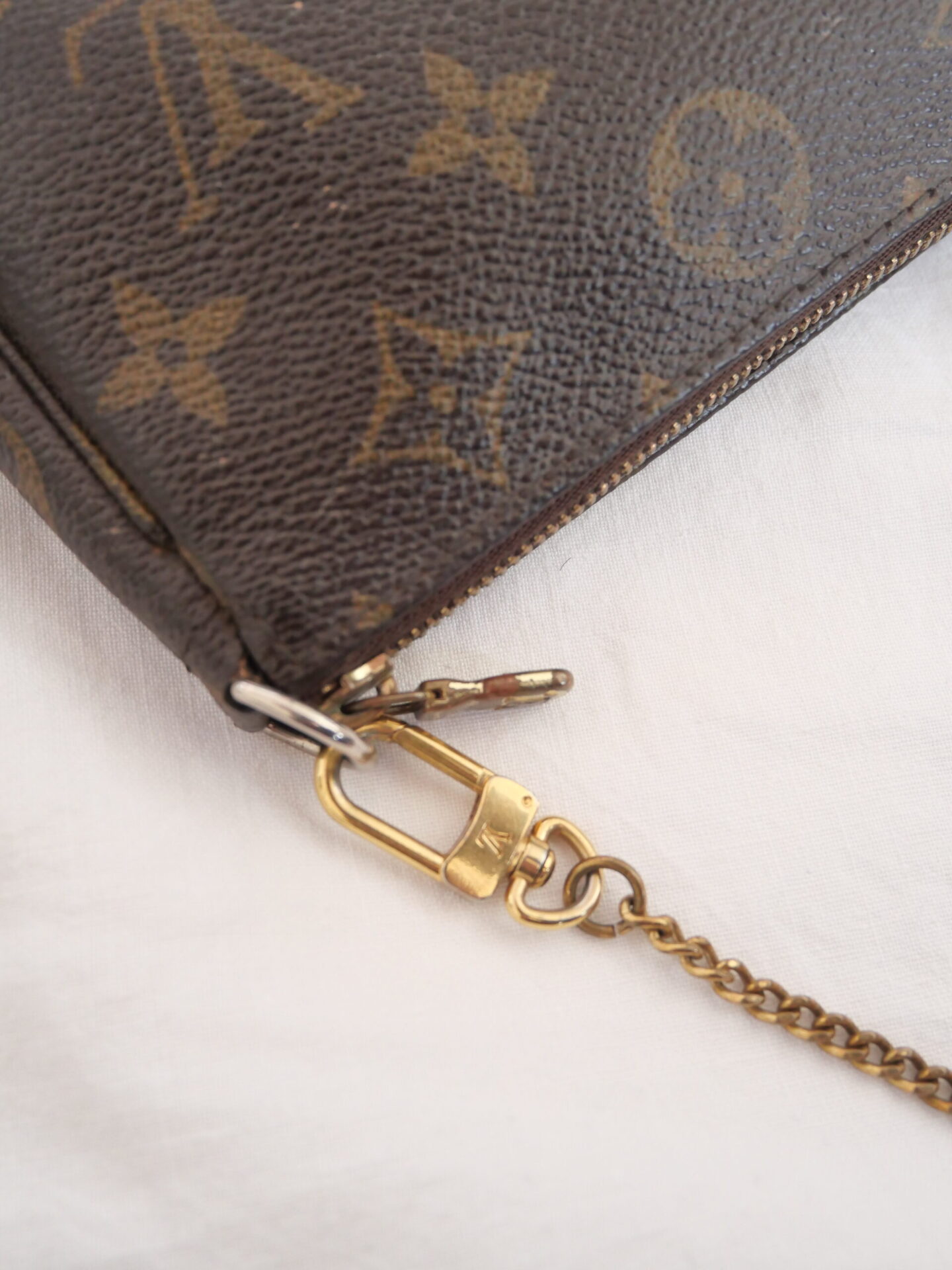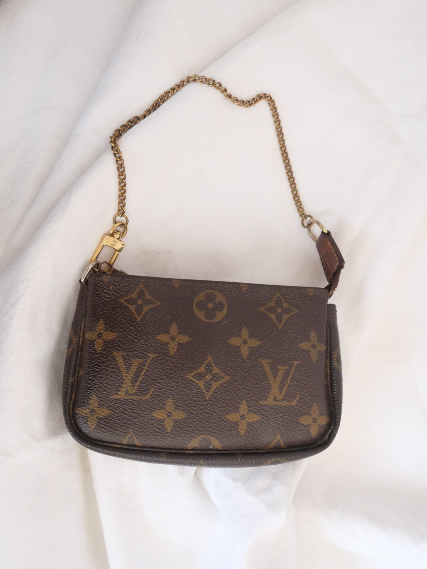 Wie süß ist denn diese Louis Vuitton Mini Pochette? Die perfekte Tasche zum Ausgehen oder als kleine Tasche mit dabei. Im klassischen Louis Vuitton Monogramm Canva gefertigt und mit einer feinen goldenen Kette abgerundet. Durch den Karabiner an der Kette, lässt sie sich super an eine größere Handtasche anlegen.