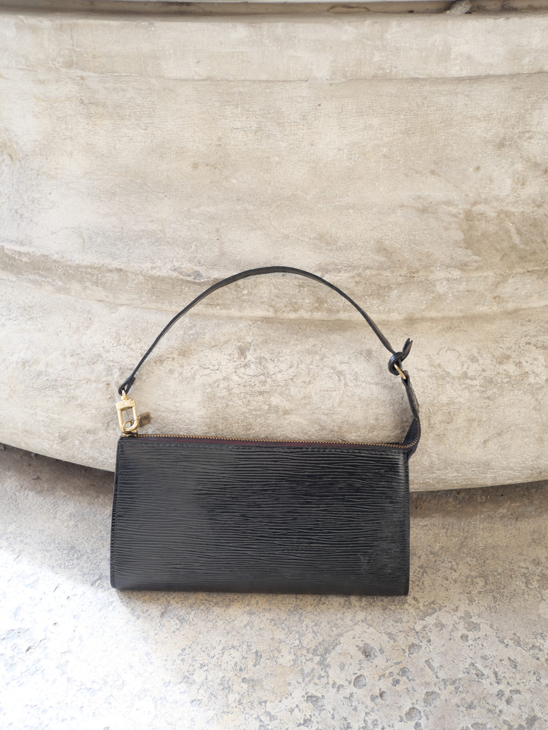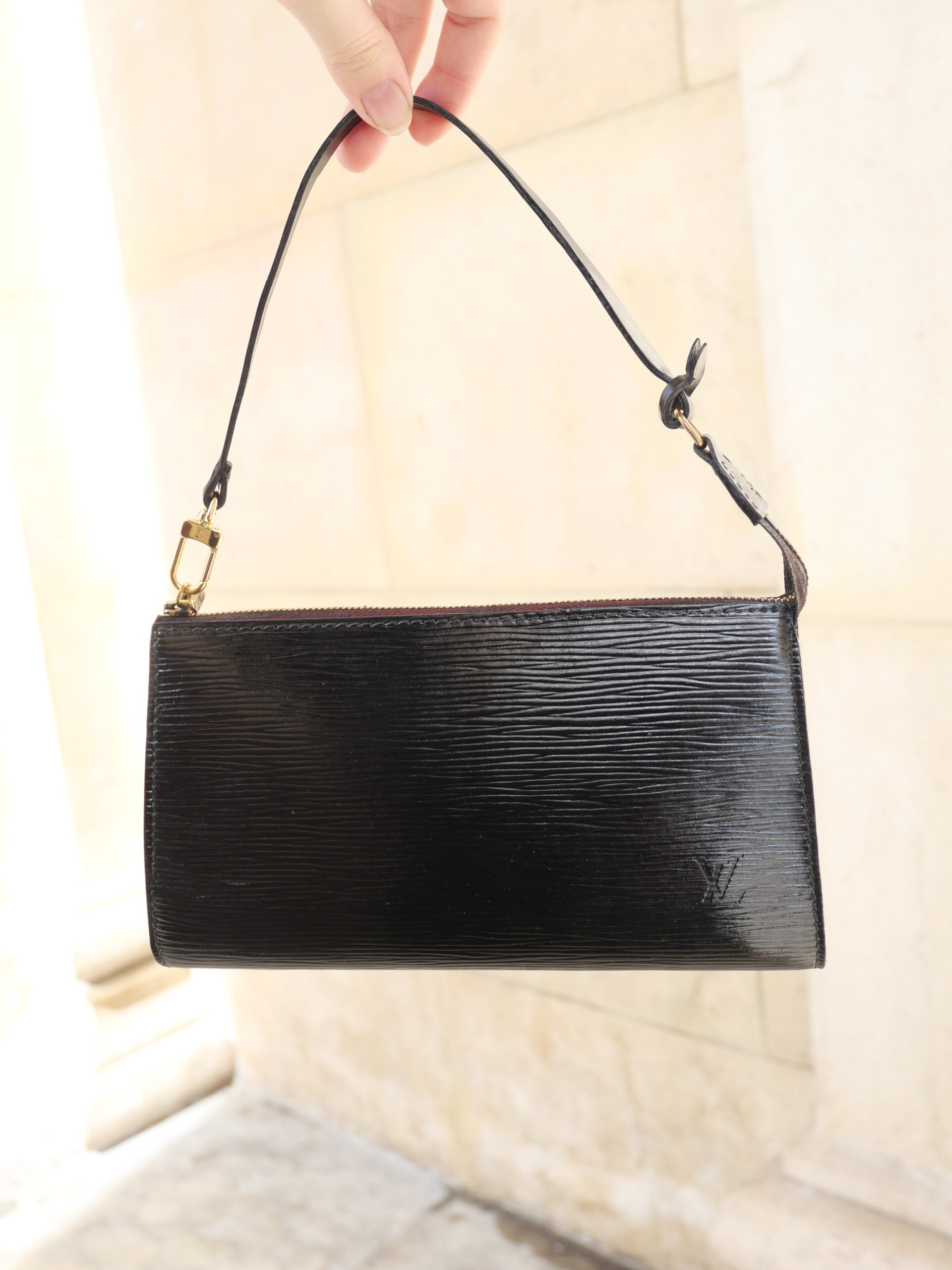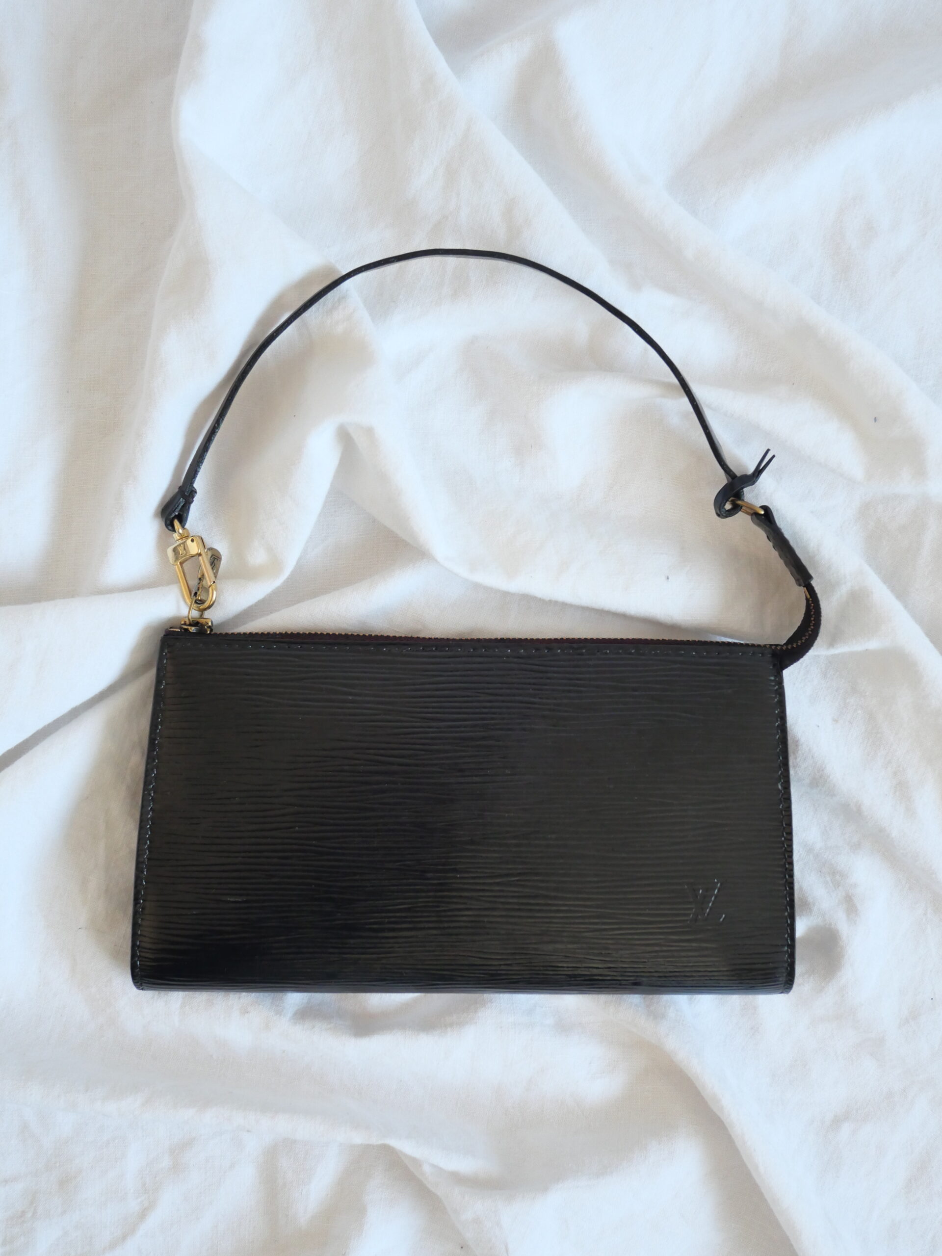 Die Louis Vuitton Pochette aus Epi Leder in Schwarz ist die perfekte Tasche im Quiet Luxury Stil. Sie hat einen tollen glänzenden Finish. Sie ist mit goldener Hardware ausgestattet und einem dezenten schwarzen LV Stempel auf der Vorderseite.