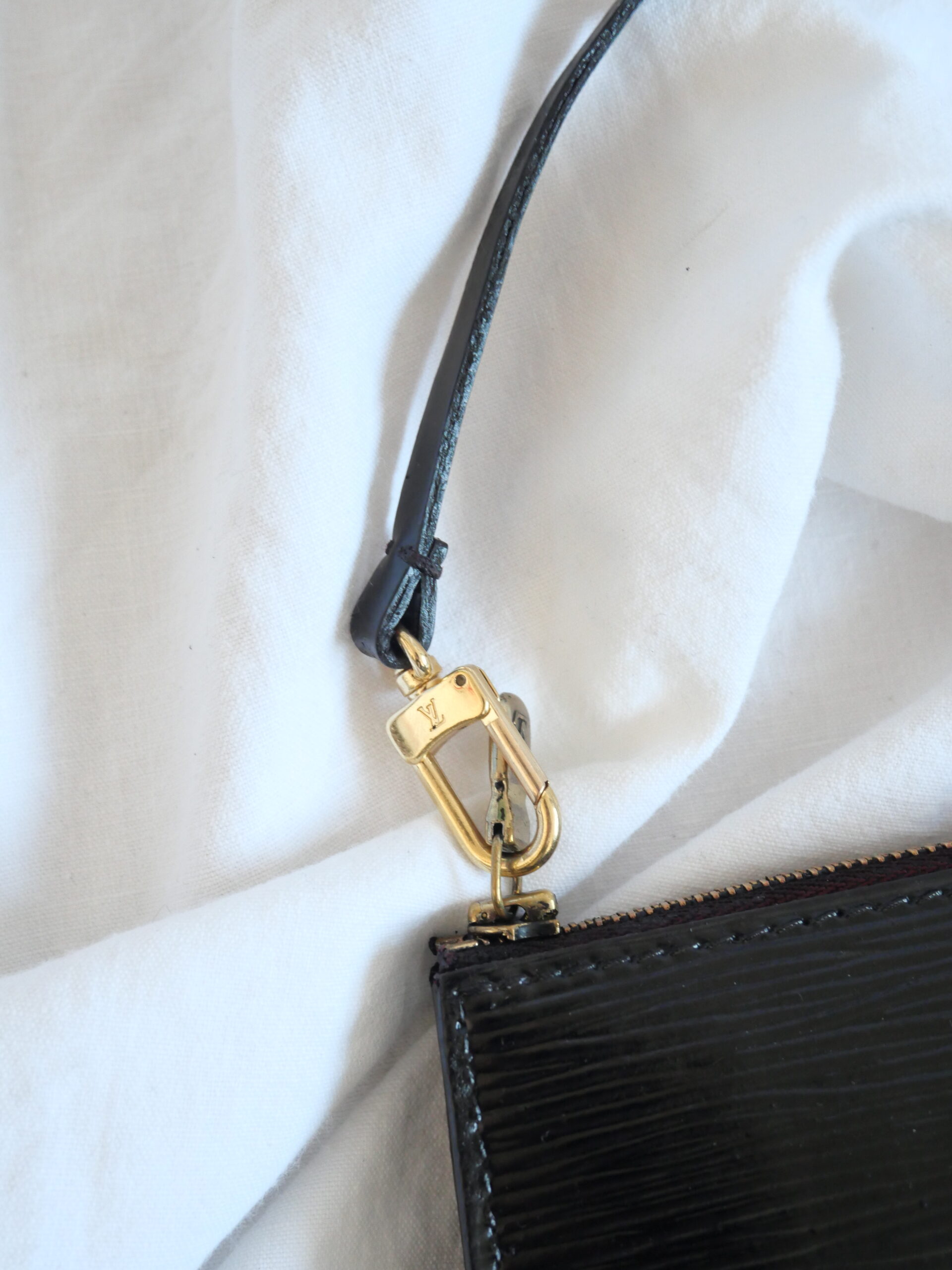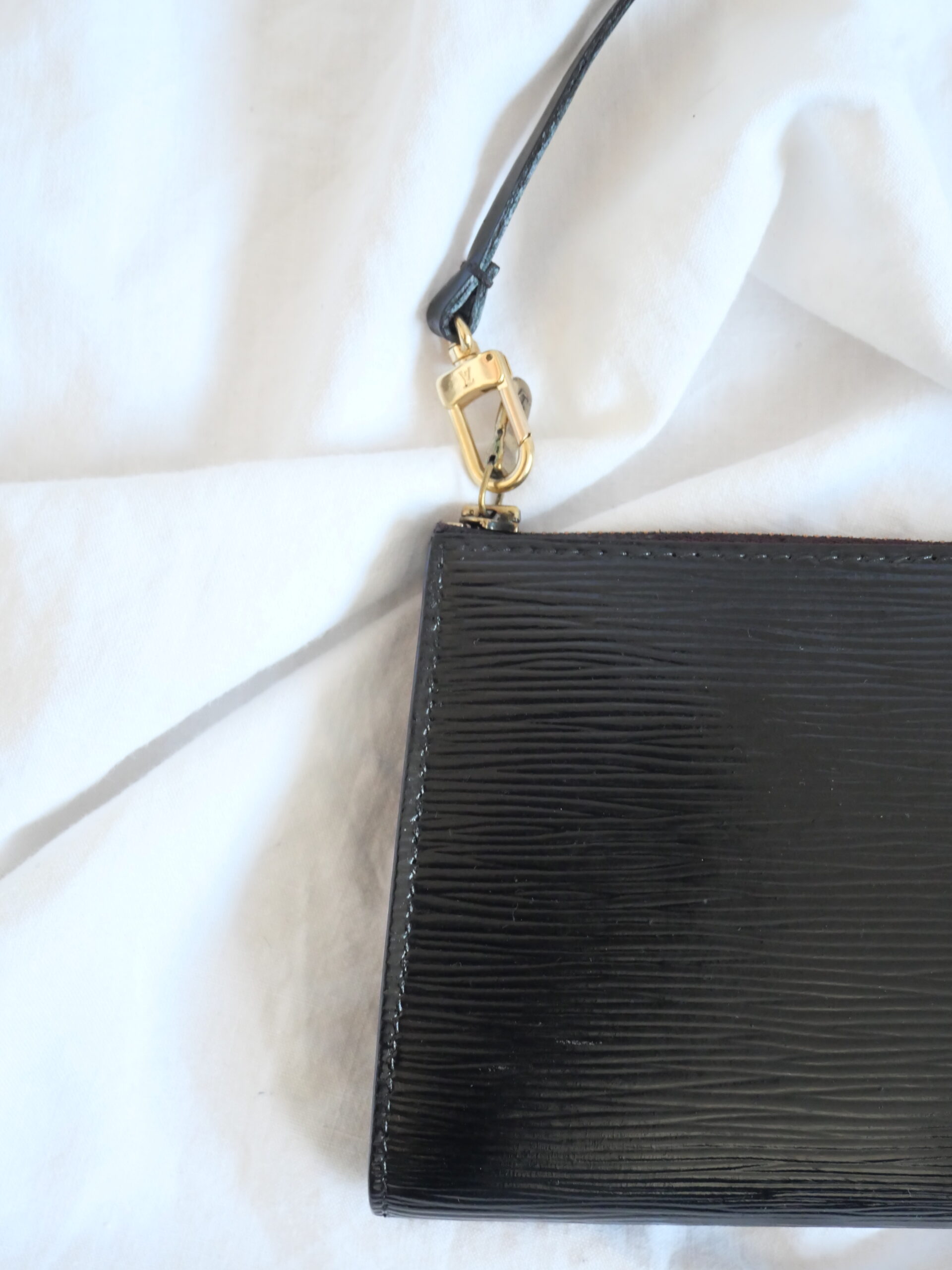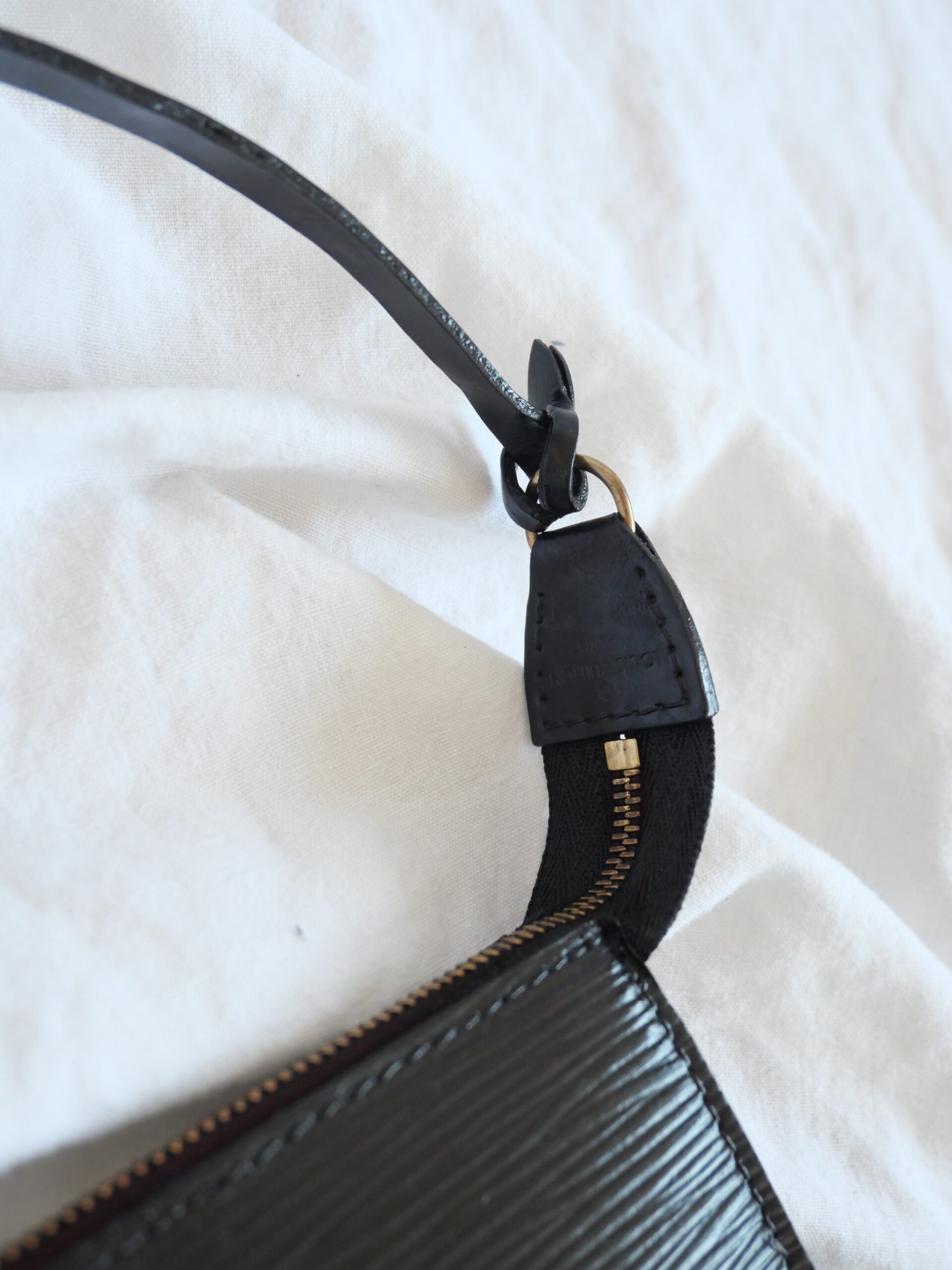 Die Louis Vuitton Pochette aus Epi Leder in Schwarz ist die perfekte Tasche im Quiet Luxury Stil. Sie hat einen tollen glänzenden Finish. Sie ist mit goldener Hardware ausgestattet und einem dezenten schwarzen LV Stempel auf der Vorderseite.