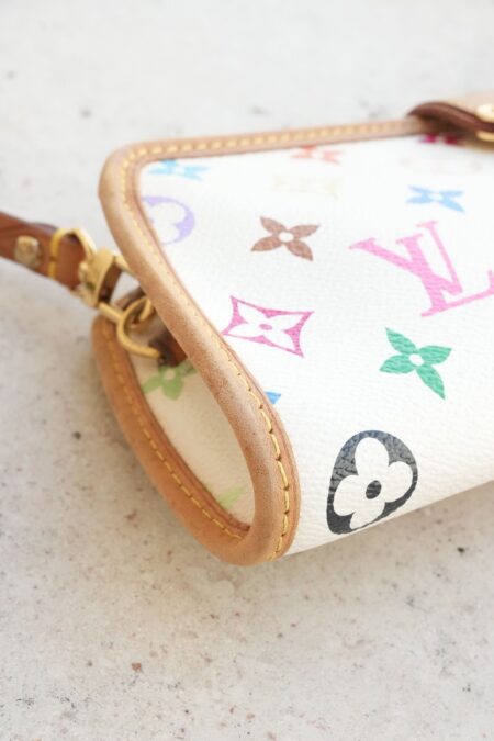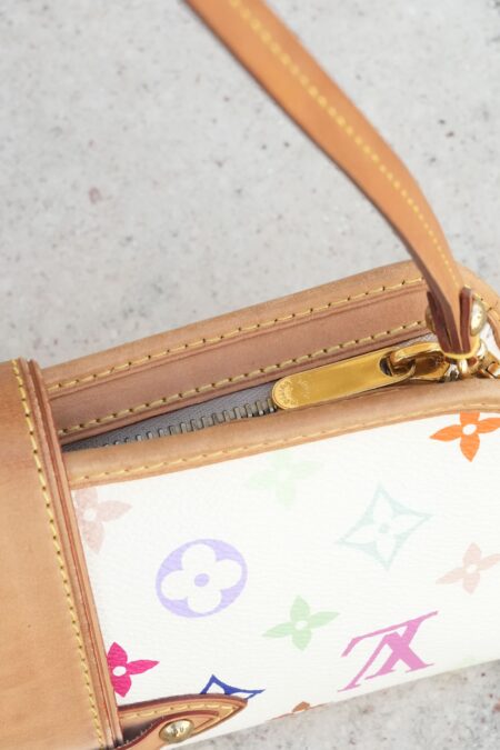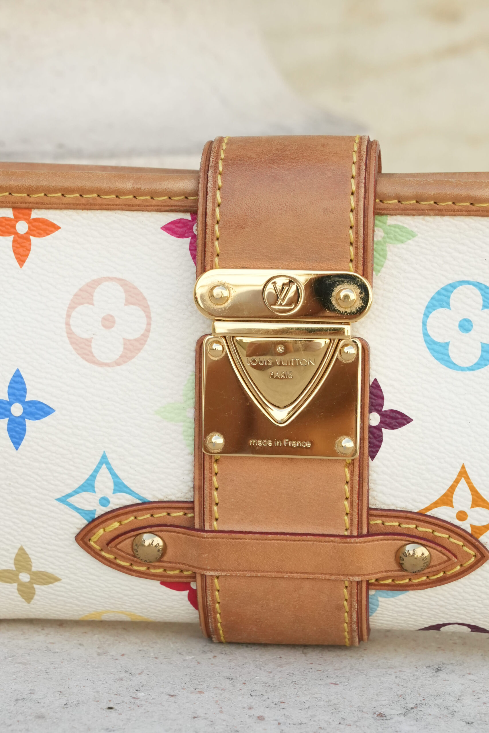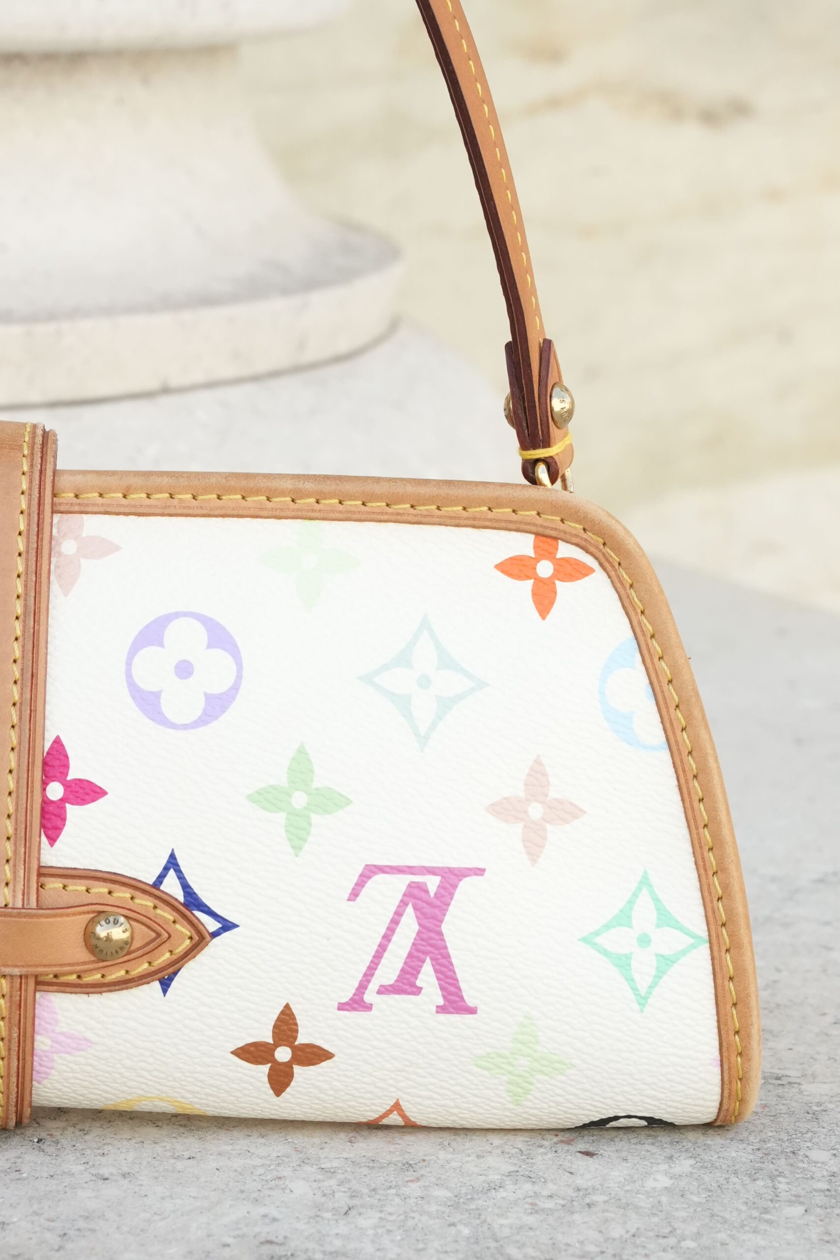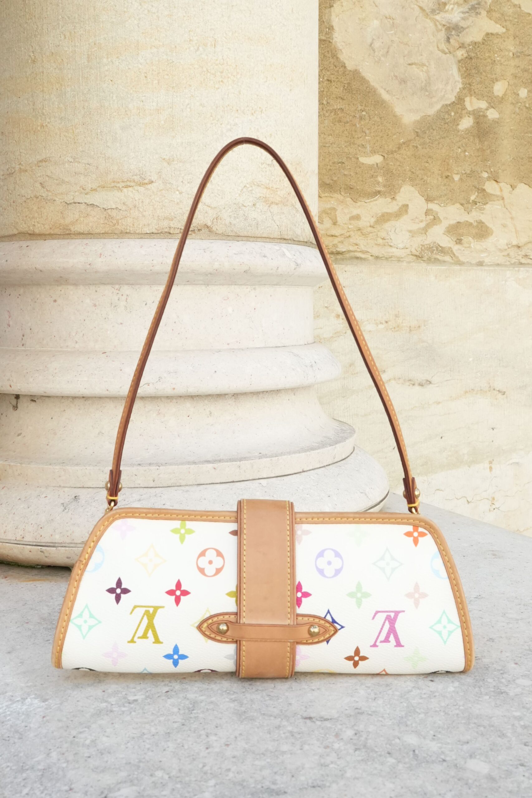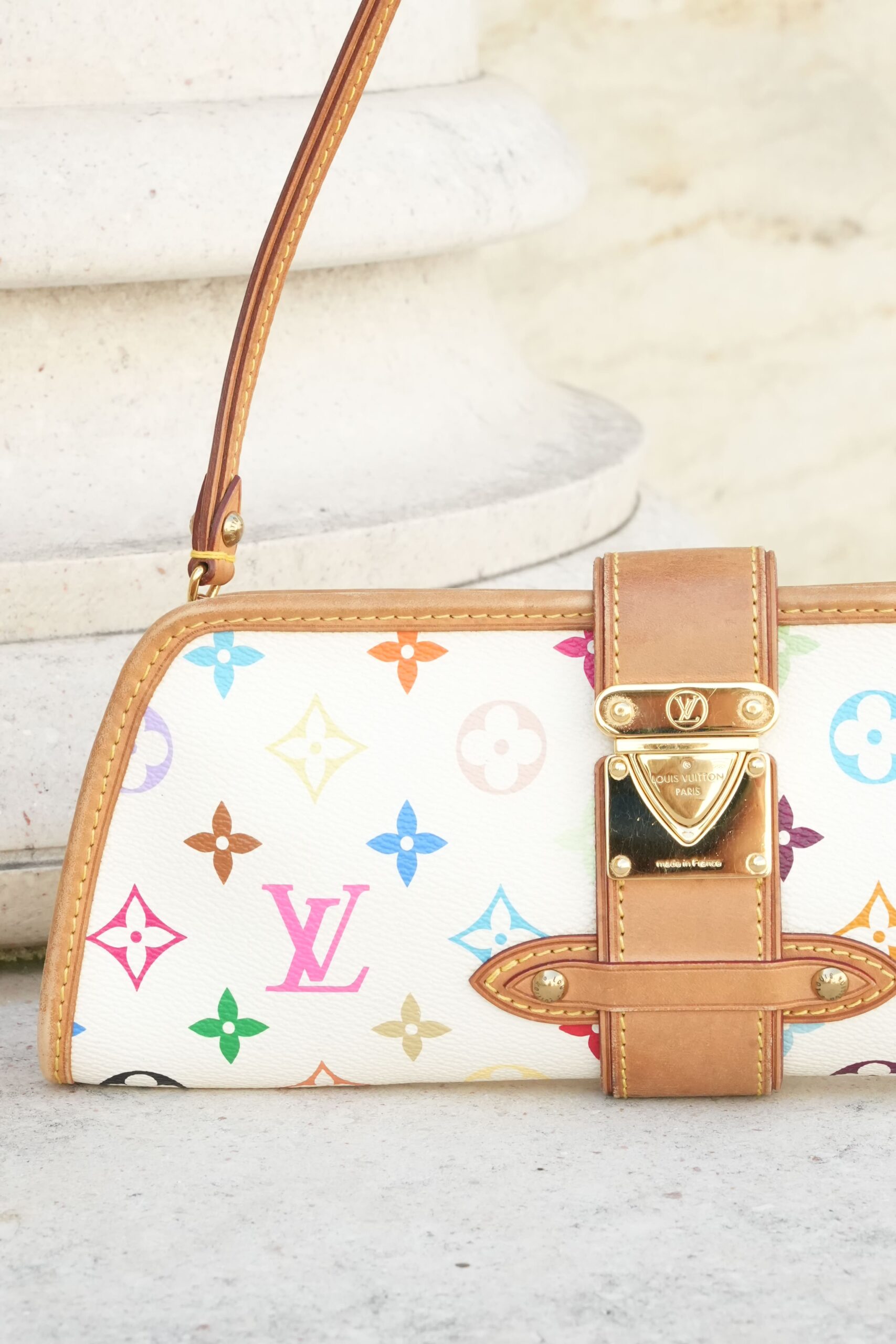 Ein wahres Sammlerstück für Vintage-Liebhaber: Die Louis Vuitton Shirley in weißem Multicolor Canvas ist ein absoluter Traum und präsentiert sich in einem fast neuwertigen Zustand. Die Farben strahlen leuchtend, das Leder zeigt sich hell und gleichmäßig, und die goldene Hardware glänzt makellos. Mit ihrem abnehmbaren Schulterriemen lässt sie sich sowohl als Clutch als auch als Schultertasche tragen. Innen begeistert sie mit weichem, rotem Leder und einem kleinen Fach für Essentials. Ein bezauberndes Stück, das sowohl im Alltag als auch in der Sammlung begeistert. Geliefert wird sie im passenden Louis Vuitton Staubbeutel.