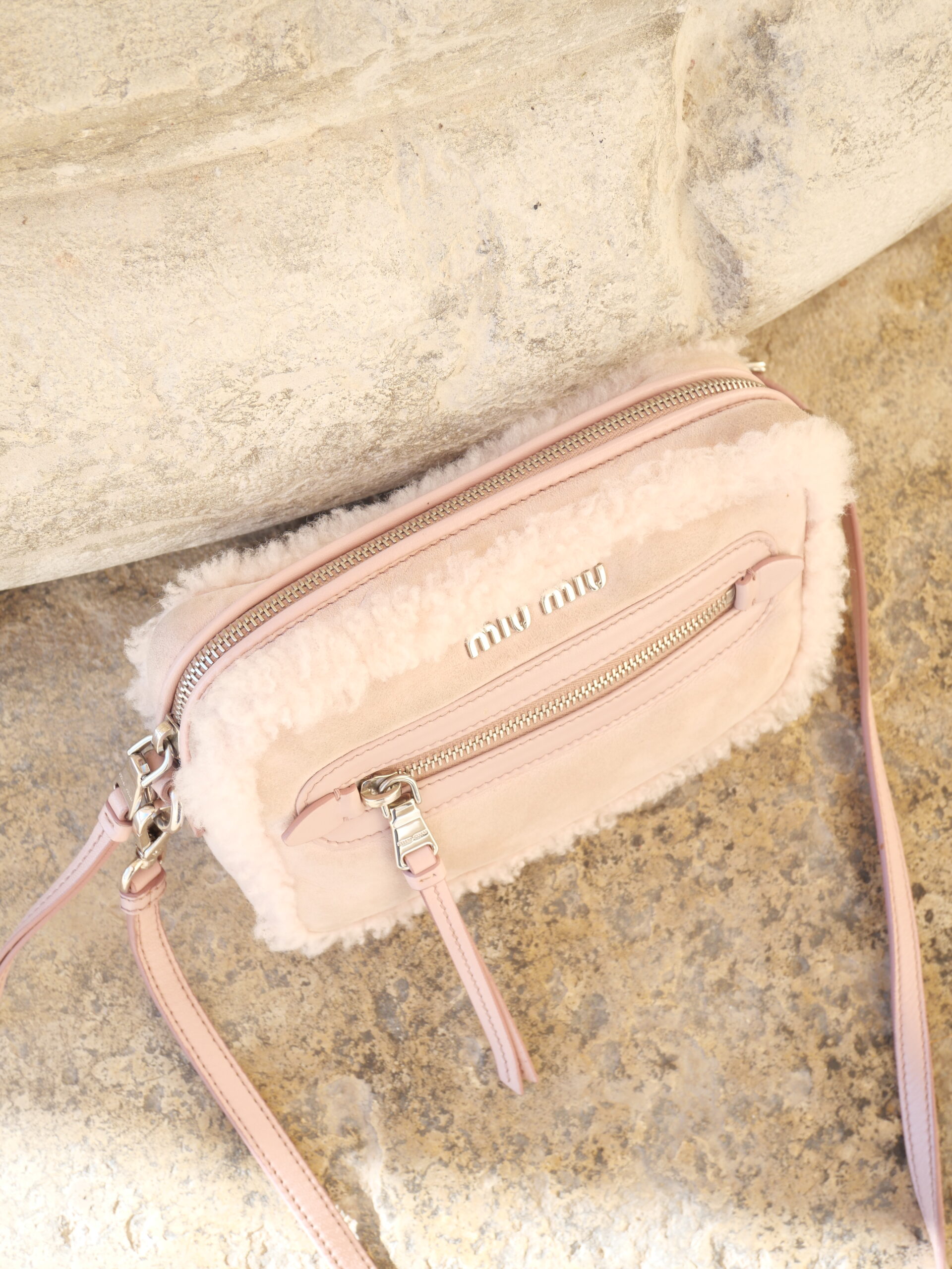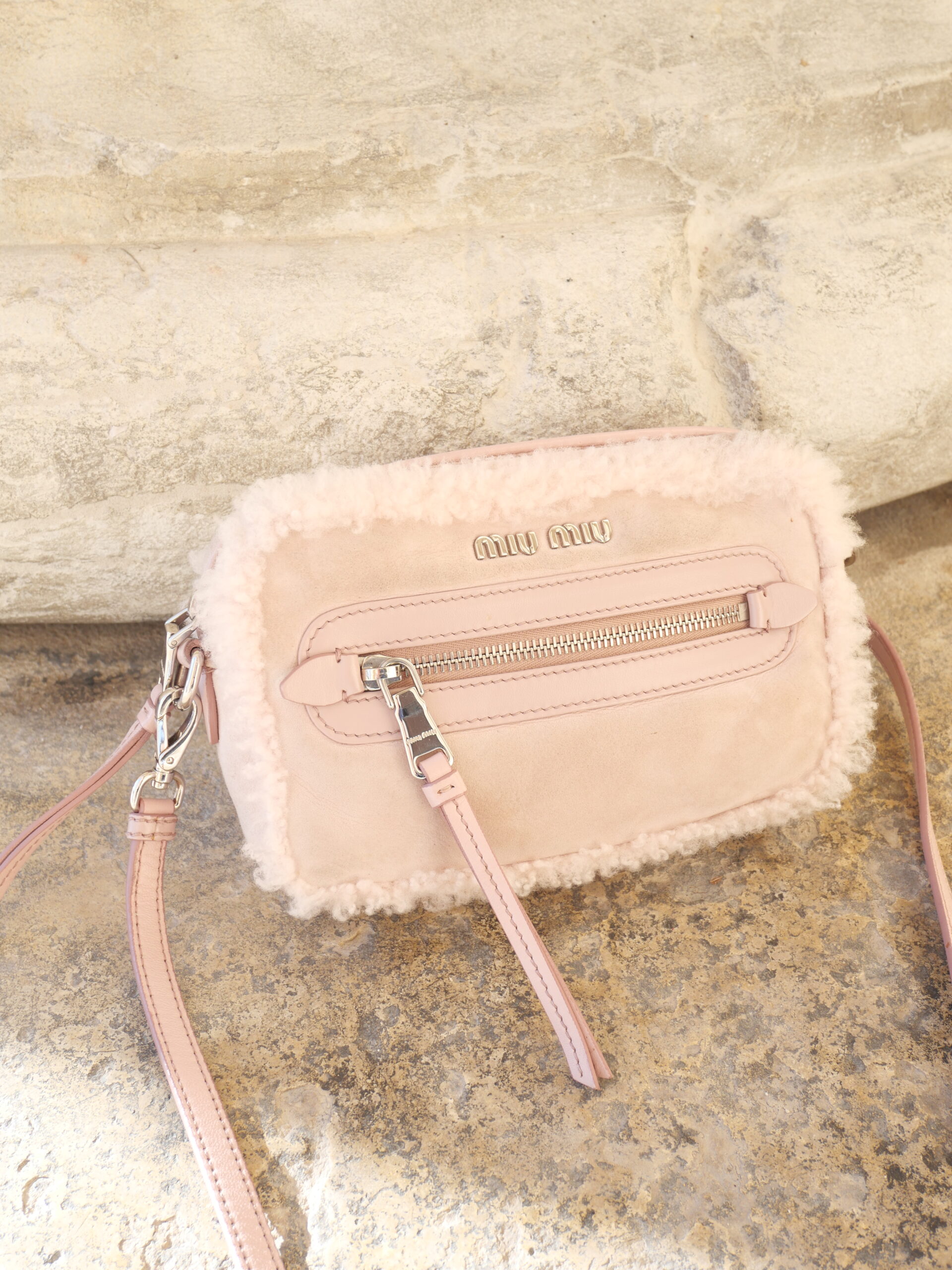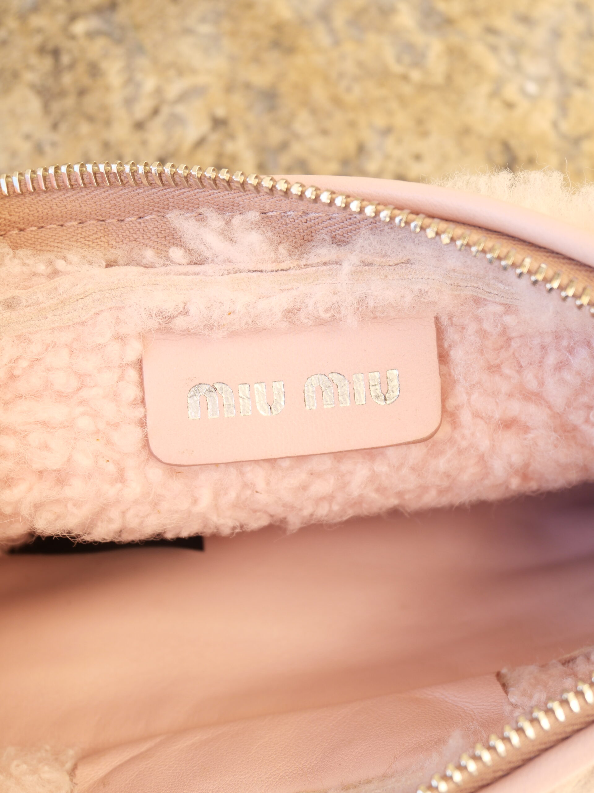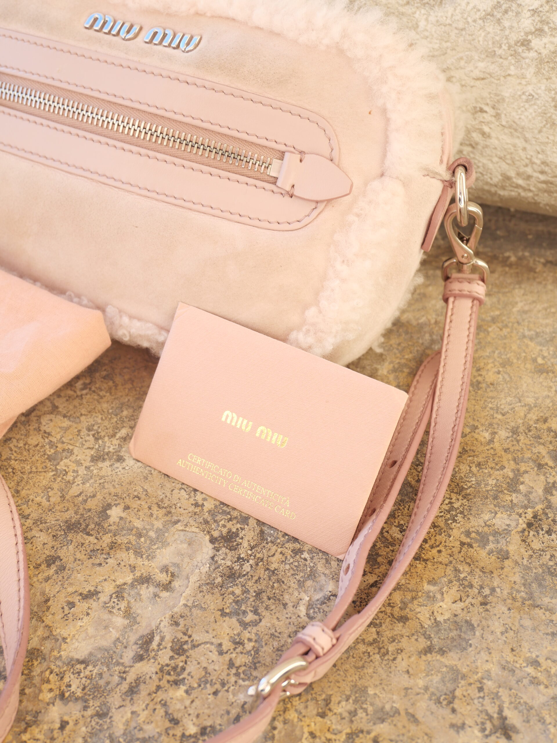 Diese Miu Miu Umhängetasche ist ein wahrer Wintertraum. Gefertigt in zartem Rosa verzaubert sie durch ihr kuschelig weiches Schafsfell und bringt den Weihnachtszauber in die Garderobe. Der verstellbare Schulterriemen sorgt für Komfort, während die kleine Vordertasche eine praktische Aufteilung ermöglicht. Geliefert wird die Tasche mit Echtheitskarte und Staubbeutel.