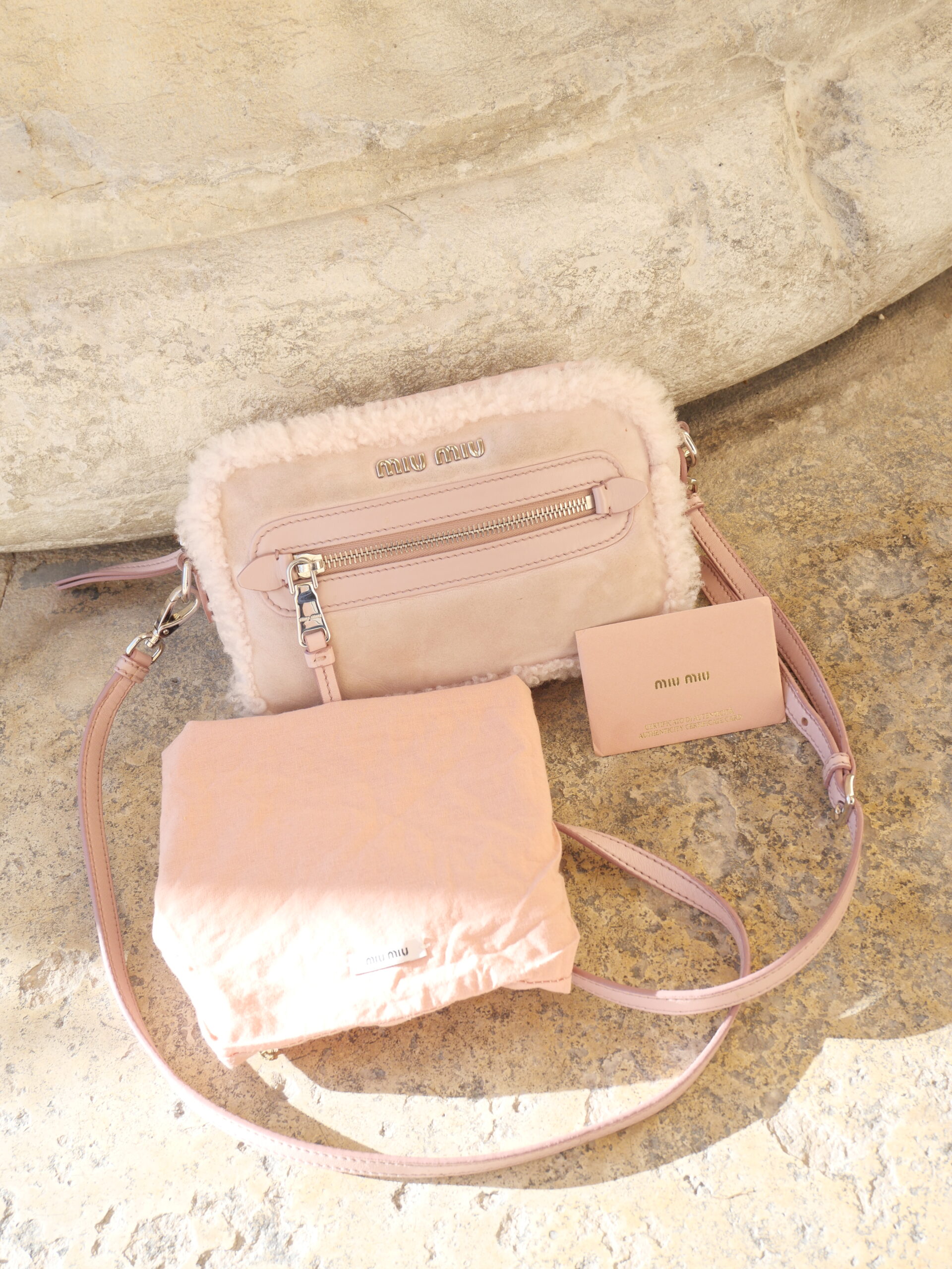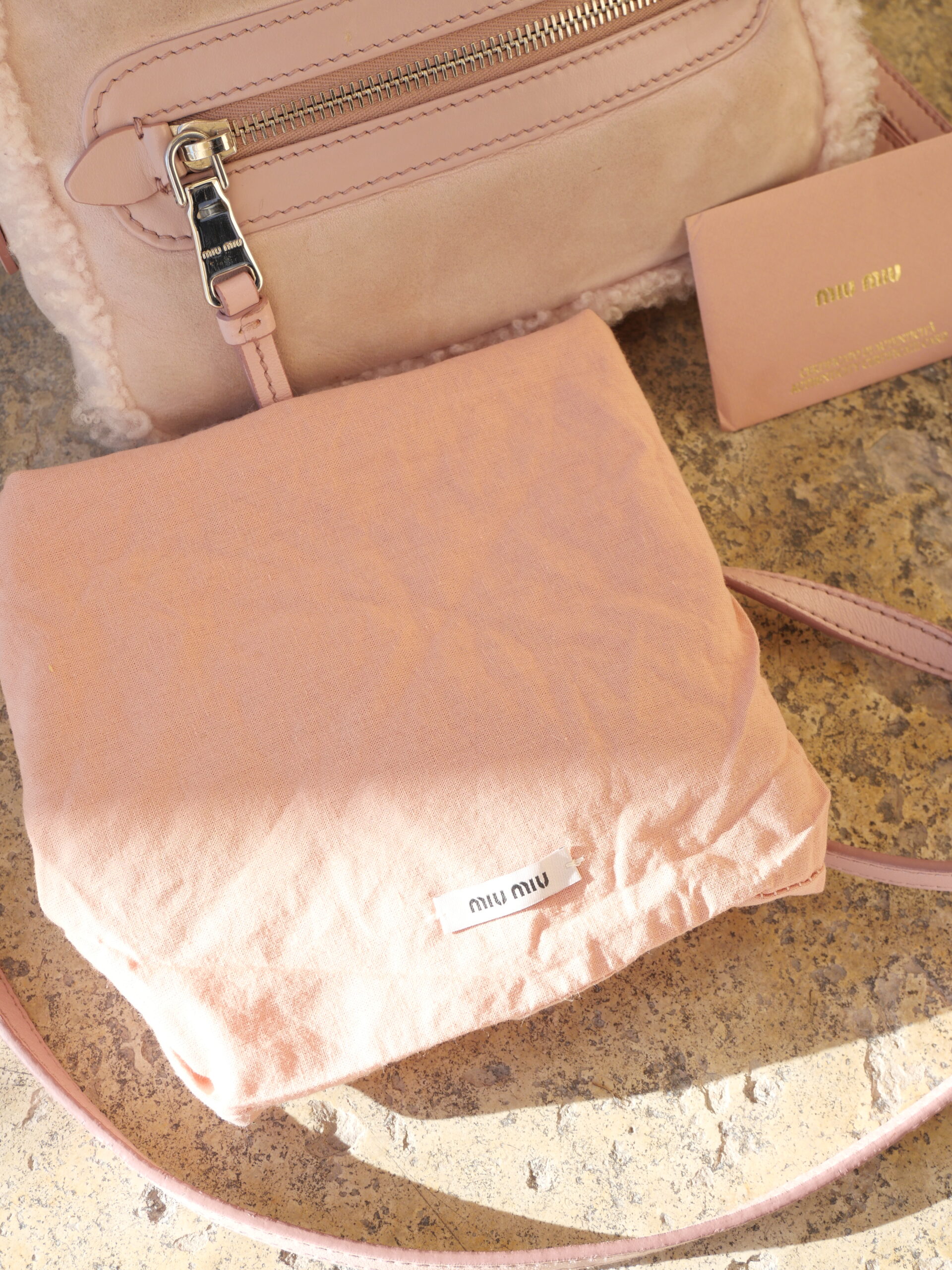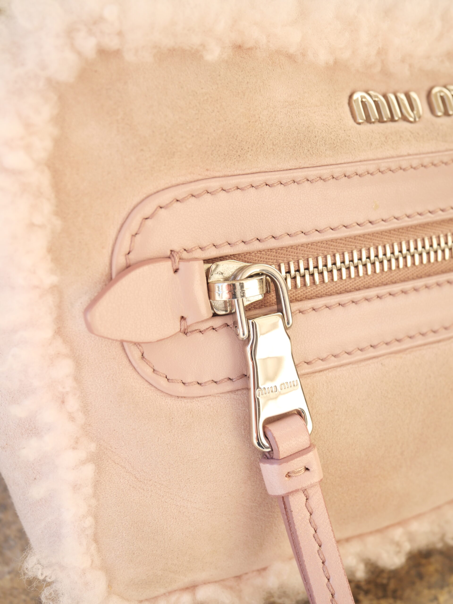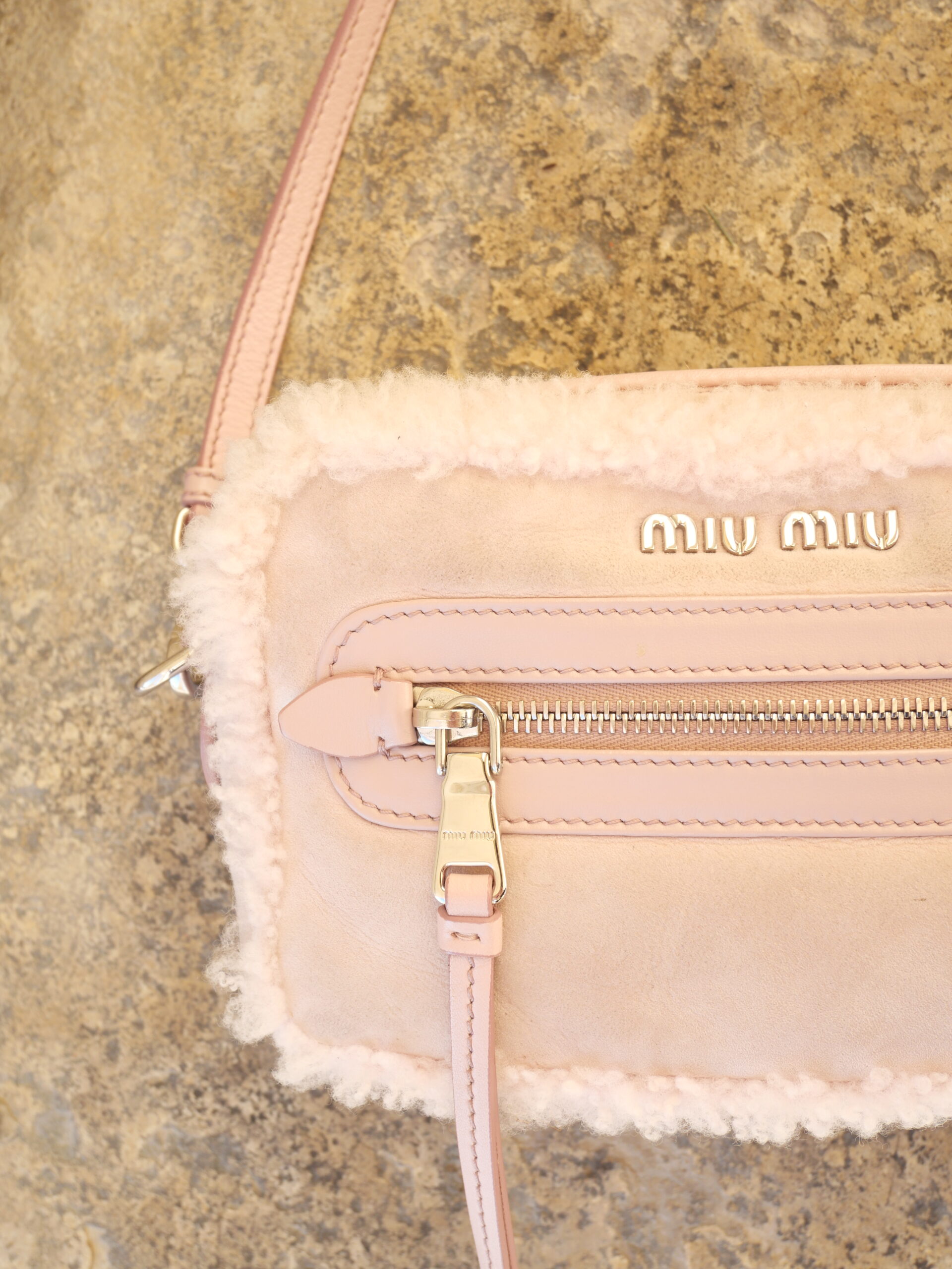 Diese Miu Miu Umhängetasche ist ein wahrer Wintertraum. Gefertigt in zartem Rosa verzaubert sie durch ihr kuschelig weiches Schafsfell und bringt den Weihnachtszauber in die Garderobe. Der verstellbare Schulterriemen sorgt für Komfort, während die kleine Vordertasche eine praktische Aufteilung ermöglicht. Geliefert wird die Tasche mit Echtheitskarte und Staubbeutel.