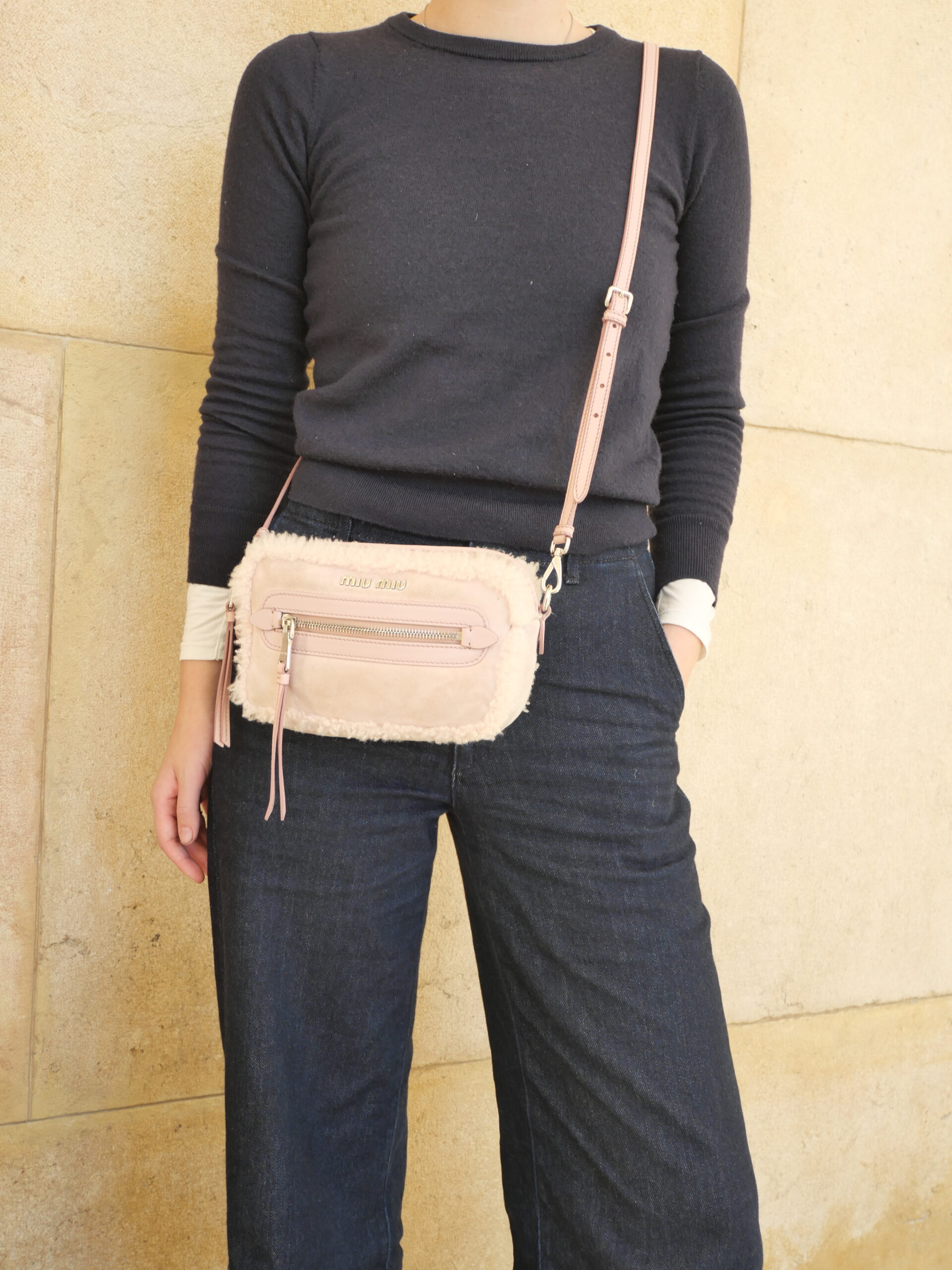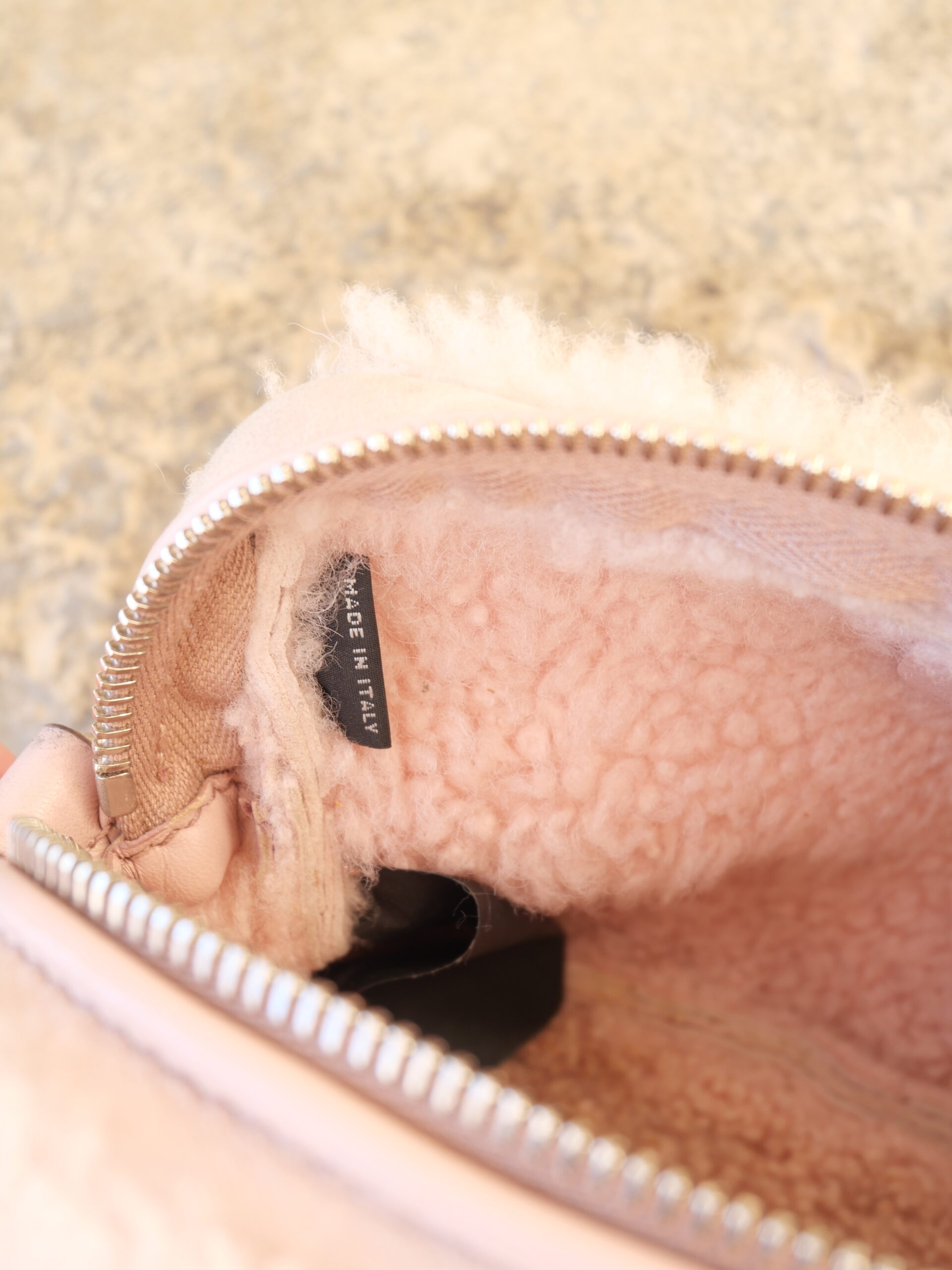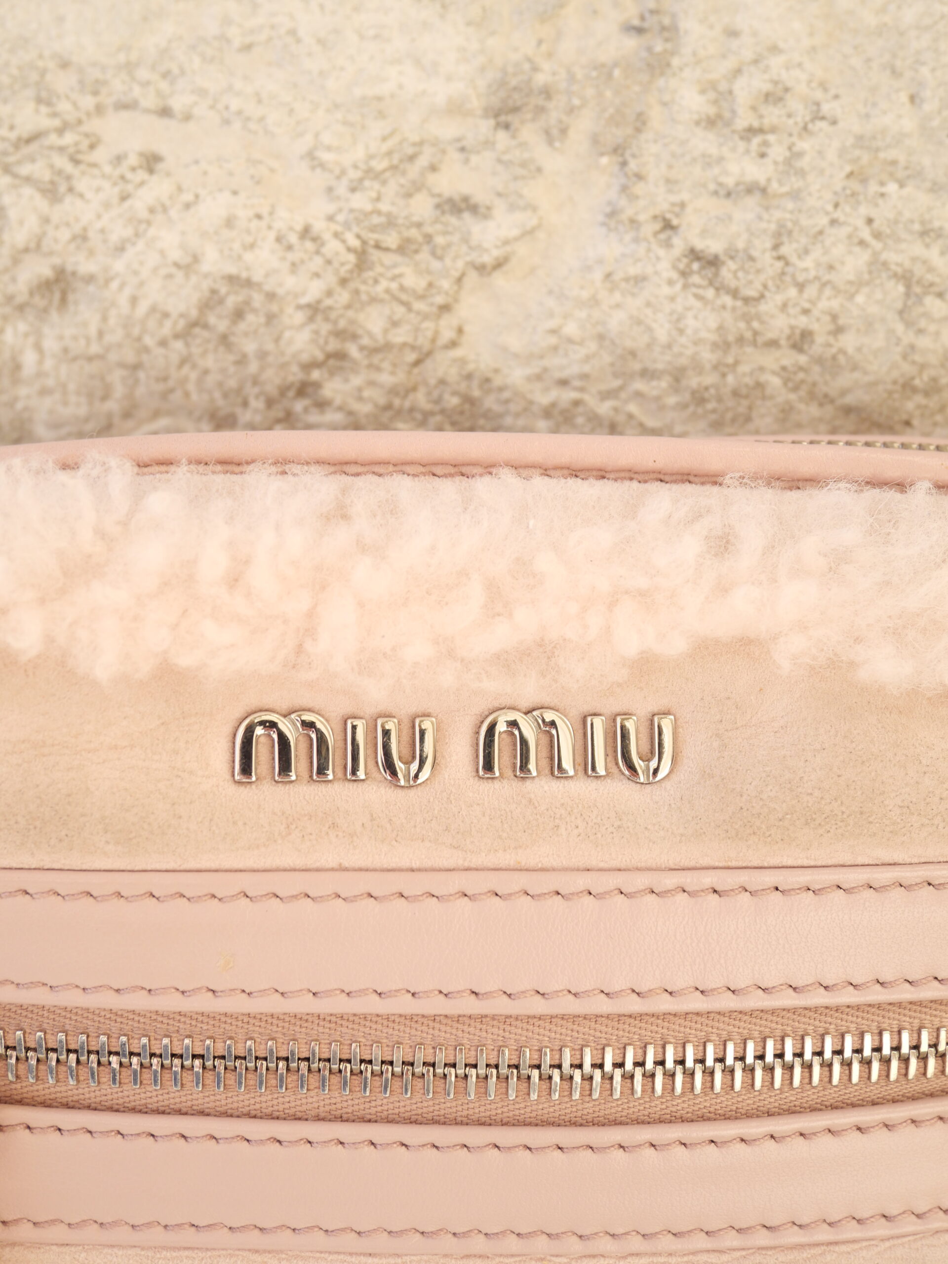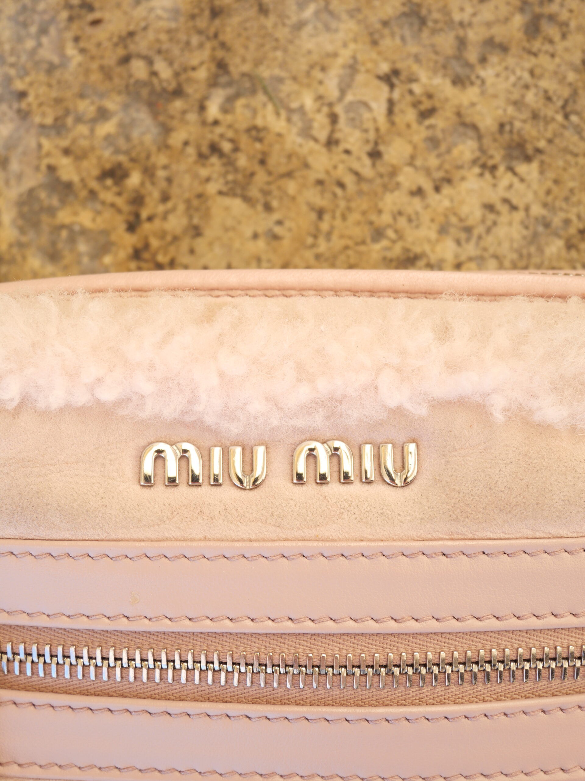 Diese Miu Miu Umhängetasche ist ein wahrer Wintertraum. Gefertigt in zartem Rosa verzaubert sie durch ihr kuschelig weiches Schafsfell und bringt den Weihnachtszauber in die Garderobe. Der verstellbare Schulterriemen sorgt für Komfort, während die kleine Vordertasche eine praktische Aufteilung ermöglicht. Geliefert wird die Tasche mit Echtheitskarte und Staubbeutel.