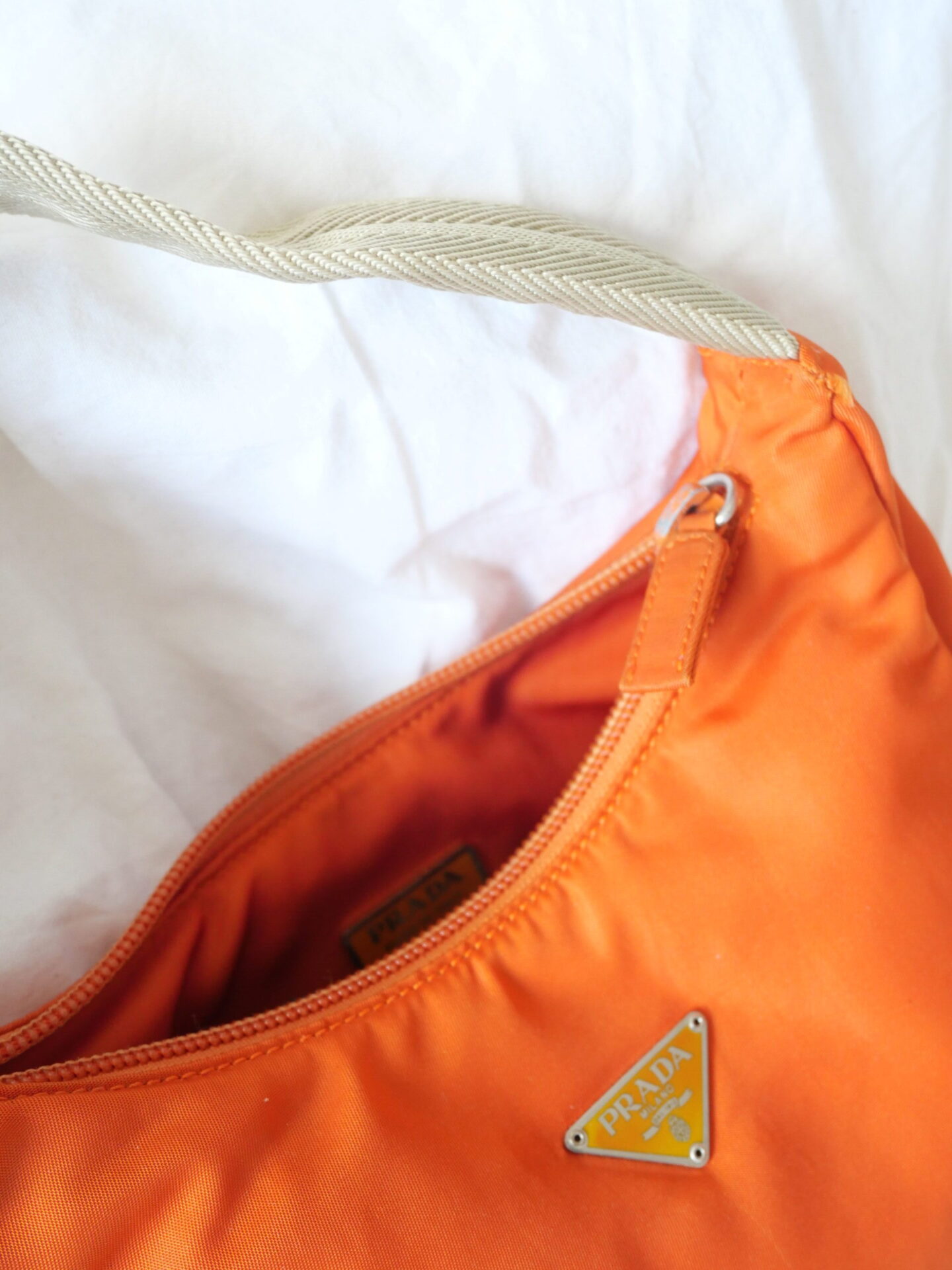Ein Klassiker als Schultertasche vom Designer Prada. Die originale Vintage Hobo aus Nylon aus dem Jahr 2002 in einem seltenen, orange mit weißem Riemen.